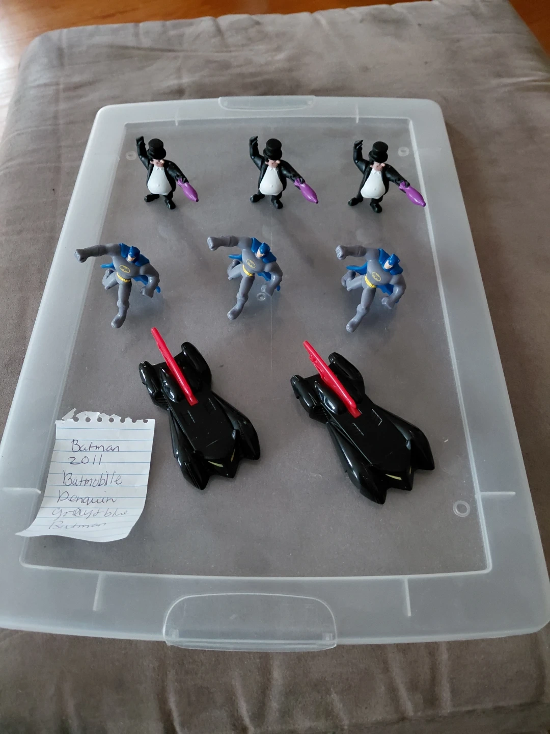 Selling a set of Batman figures from 2011! This includes the Batmobile 2, Penguin 3, and Gray/Blue Batman figures 3.