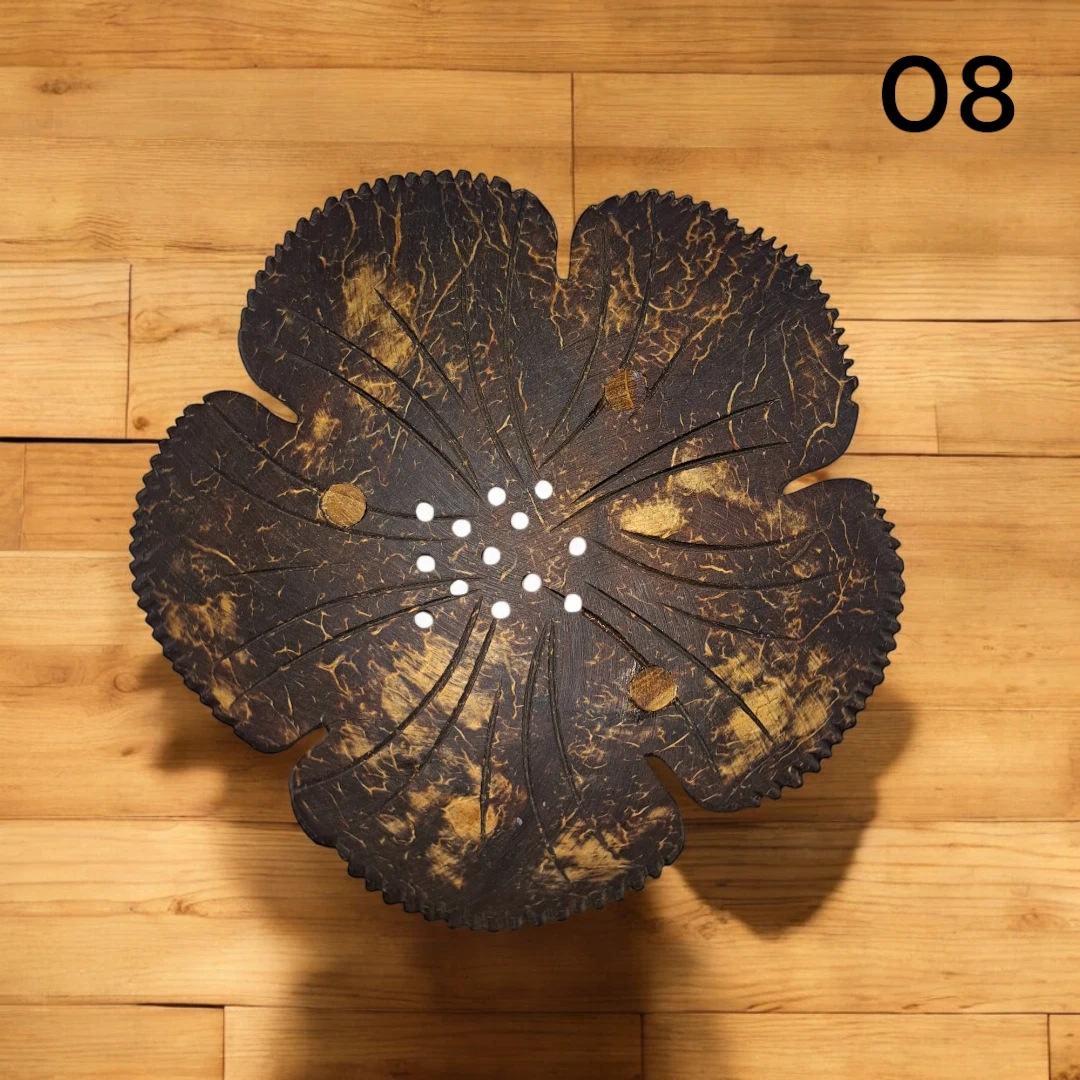 Unique, handmade soap dish crafted from a natural coconut shell. It's designed with a flower shape and features small wooden legs for stability. Drainage holes prevent water from pooling. This dish would be useful in a bathroom or kitchen sink area.