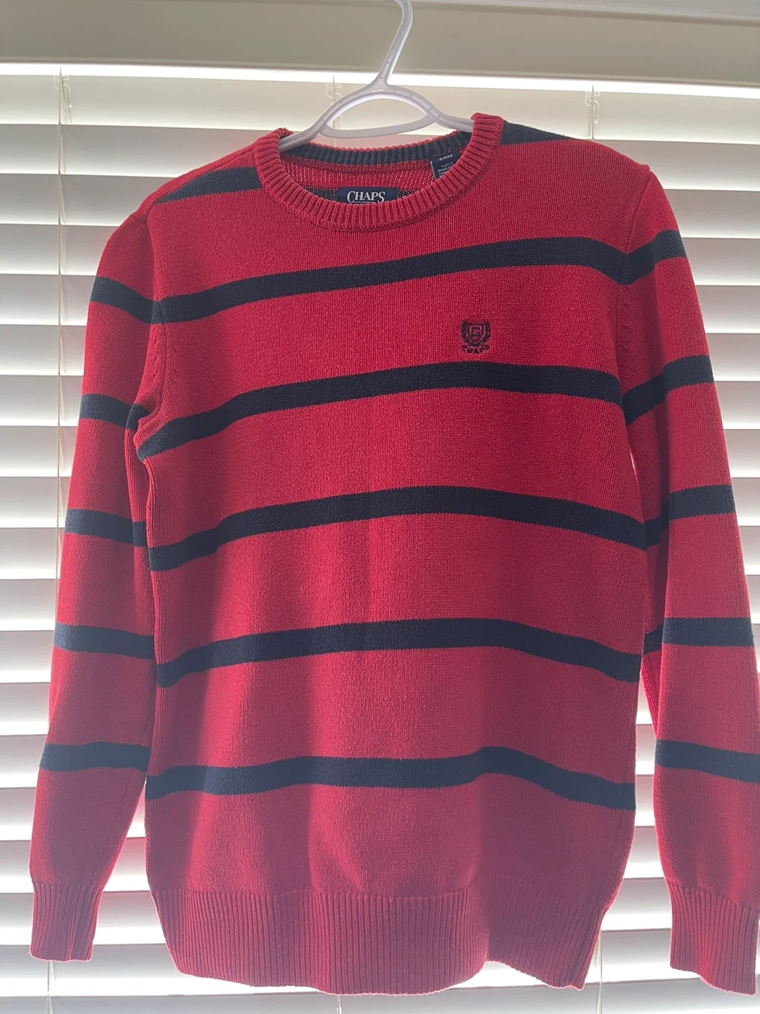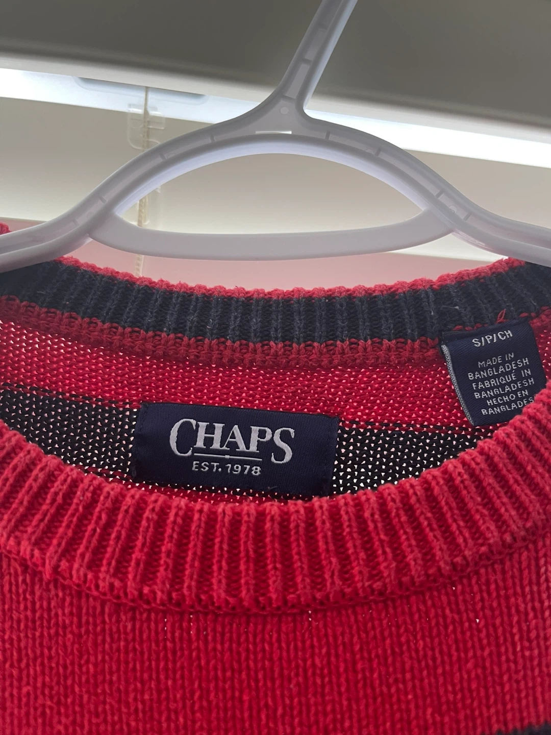 Selling a Chaps crew neck sweater in red with black stripes. It's a size small and made of 72% cotton and 28% polyester. Machine washable!