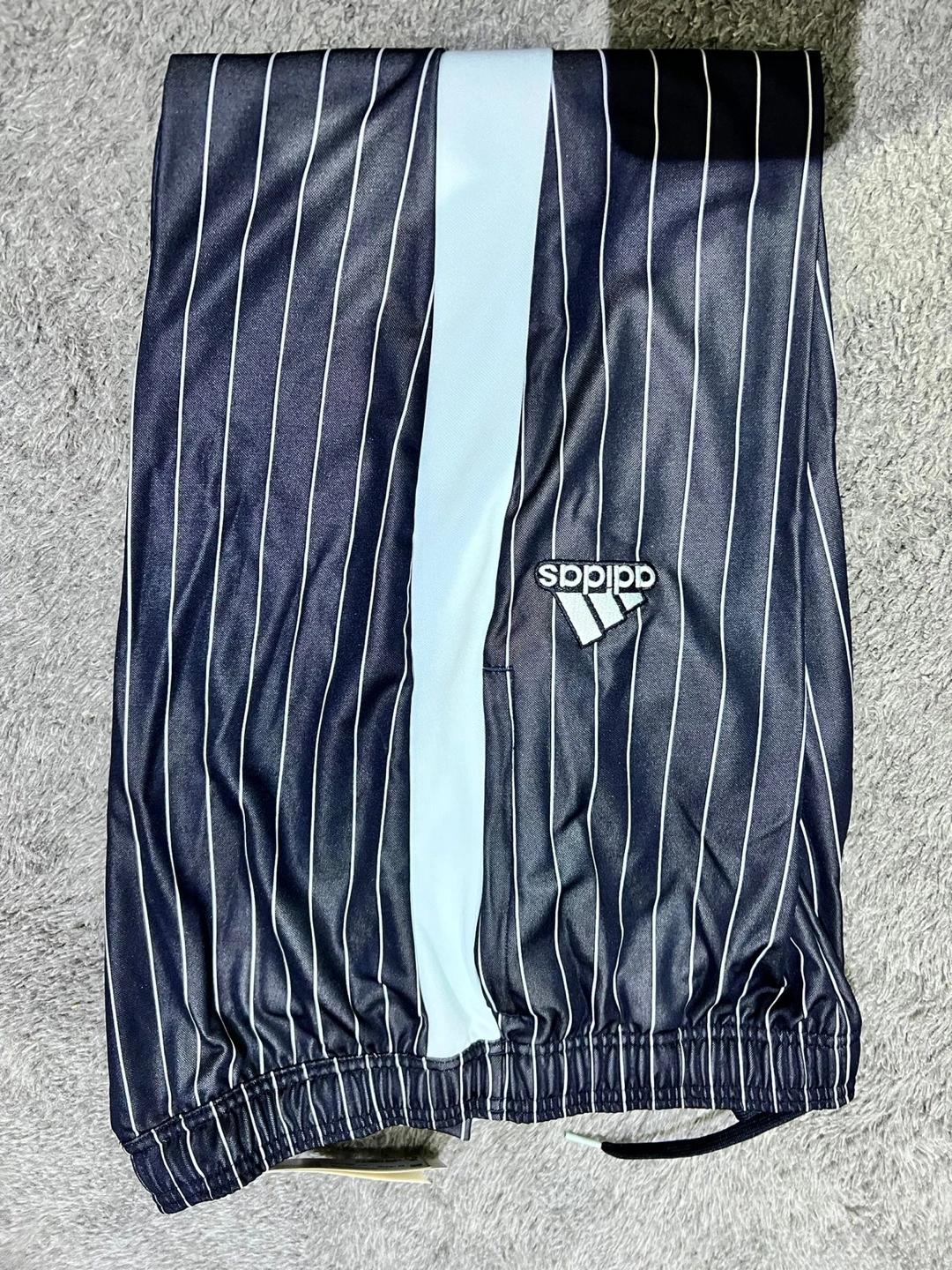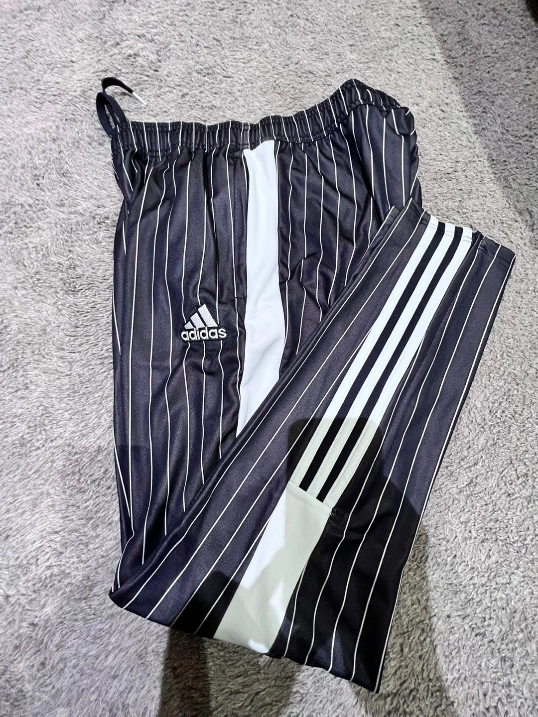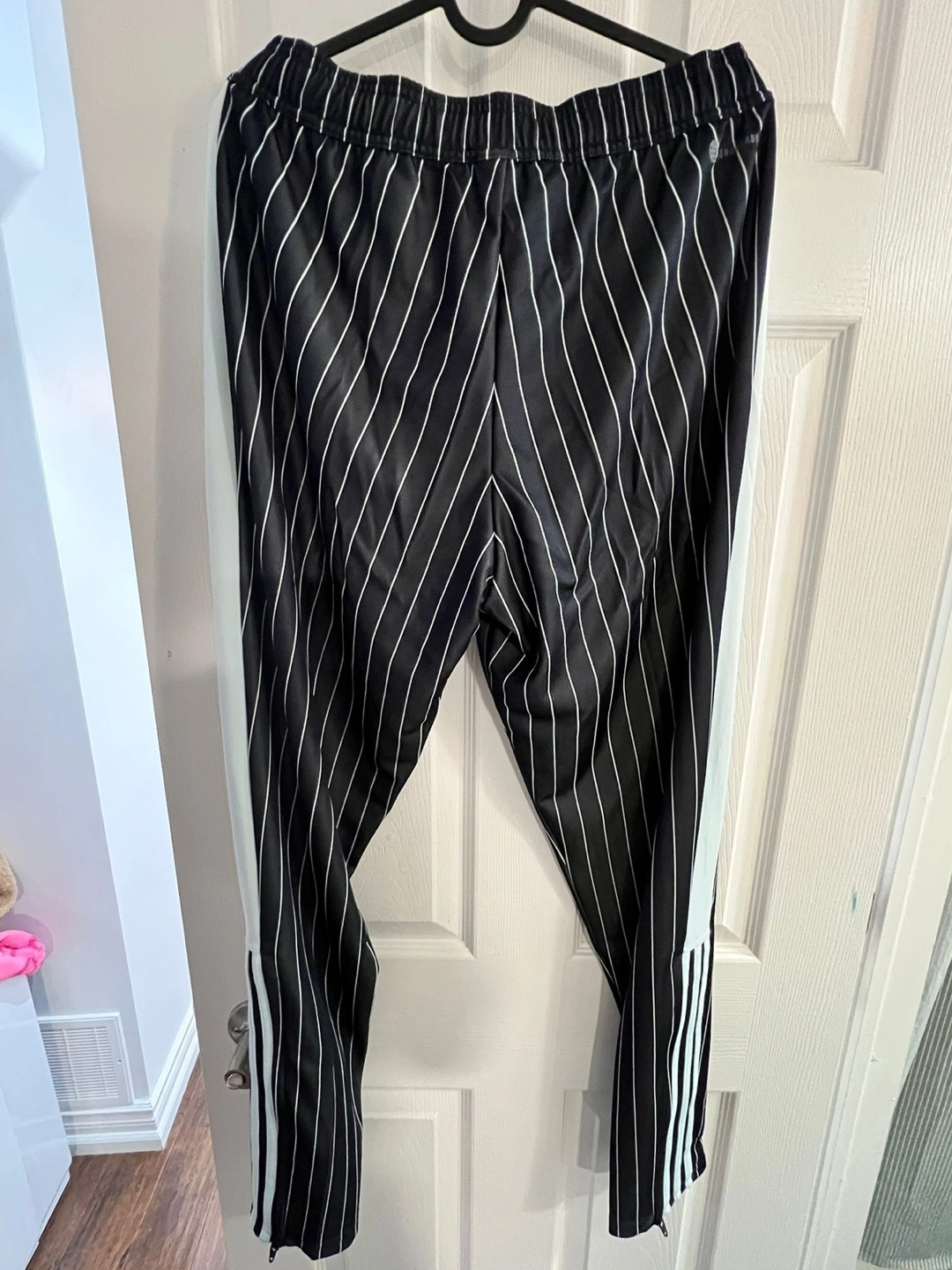 Black pinstripe track pants with white stripes down the sides. Elastic waistband with drawstring. Zip pockets on the sides.