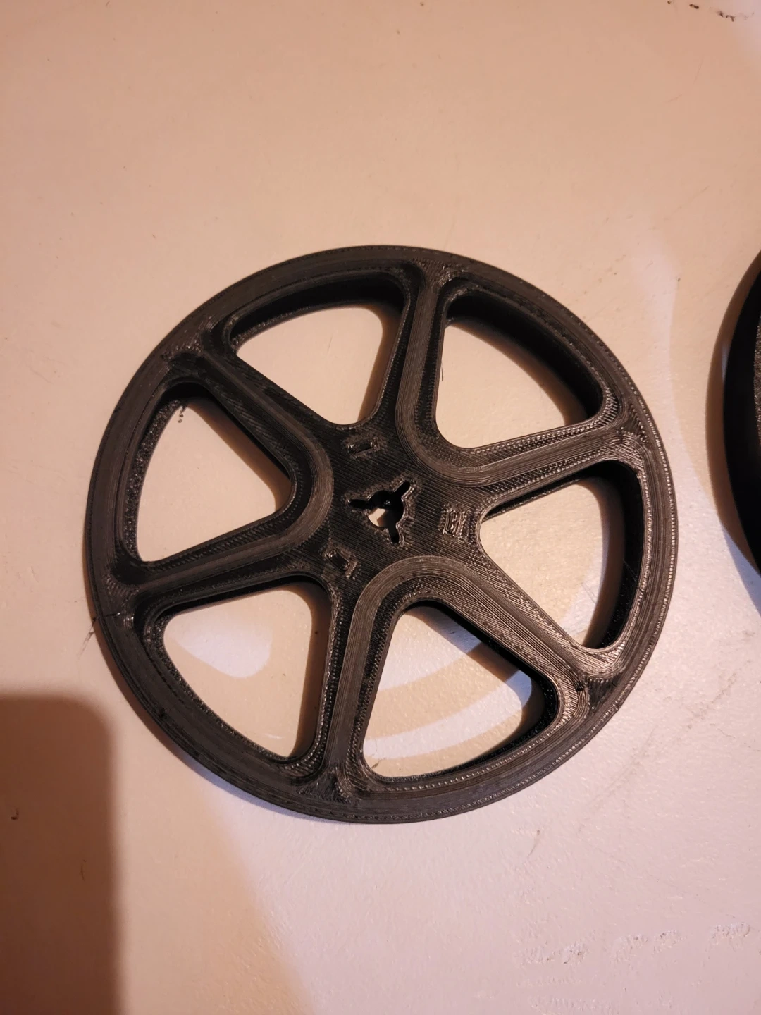 Selling a set of black film reels. They appear to be in good condition and come in two sizes. They both fit together, the larger just needs glue to help it stay stuck. The price is for the smaller one. Larger is twice the cost. Printed to order so I can make as many as you need.