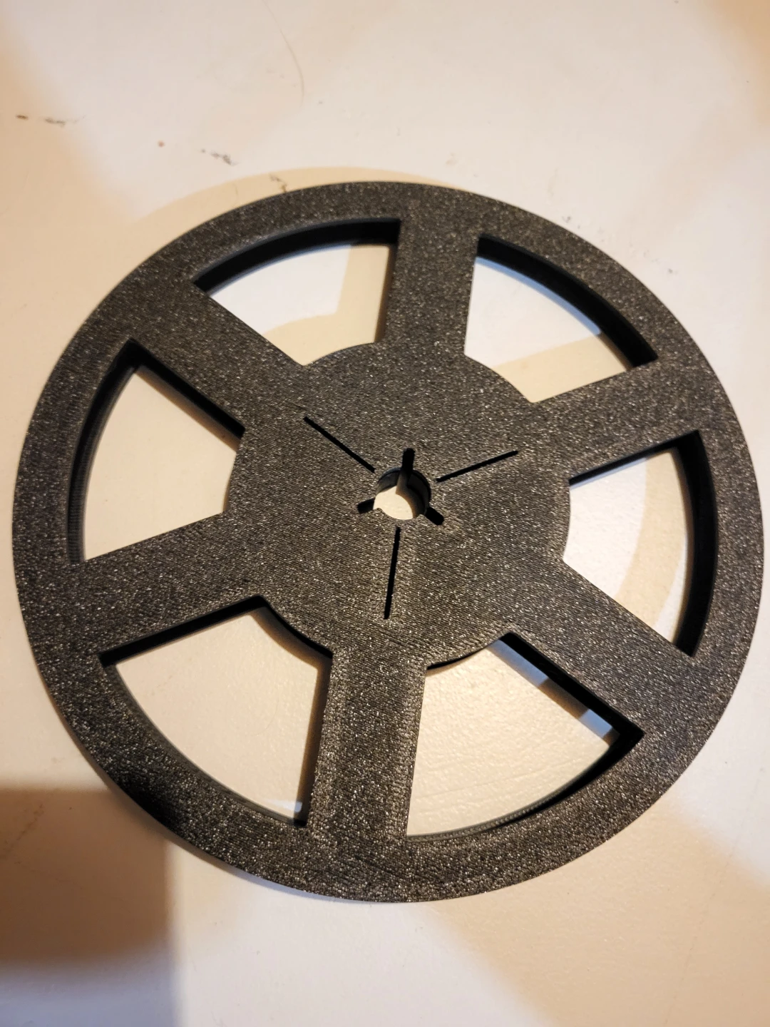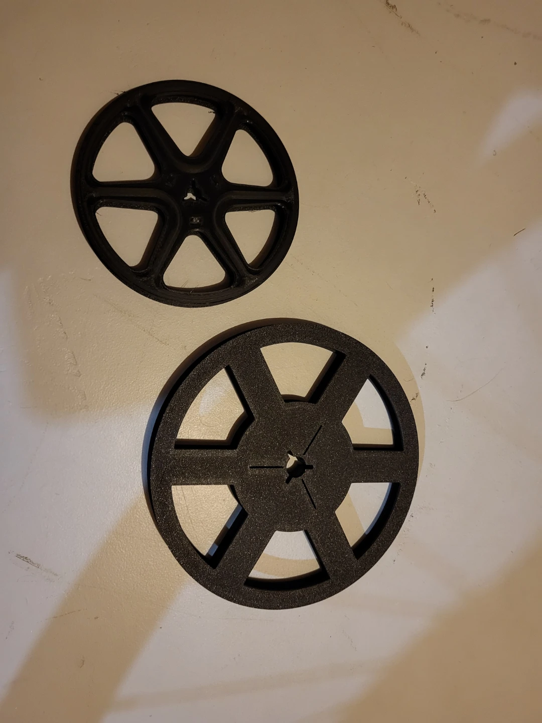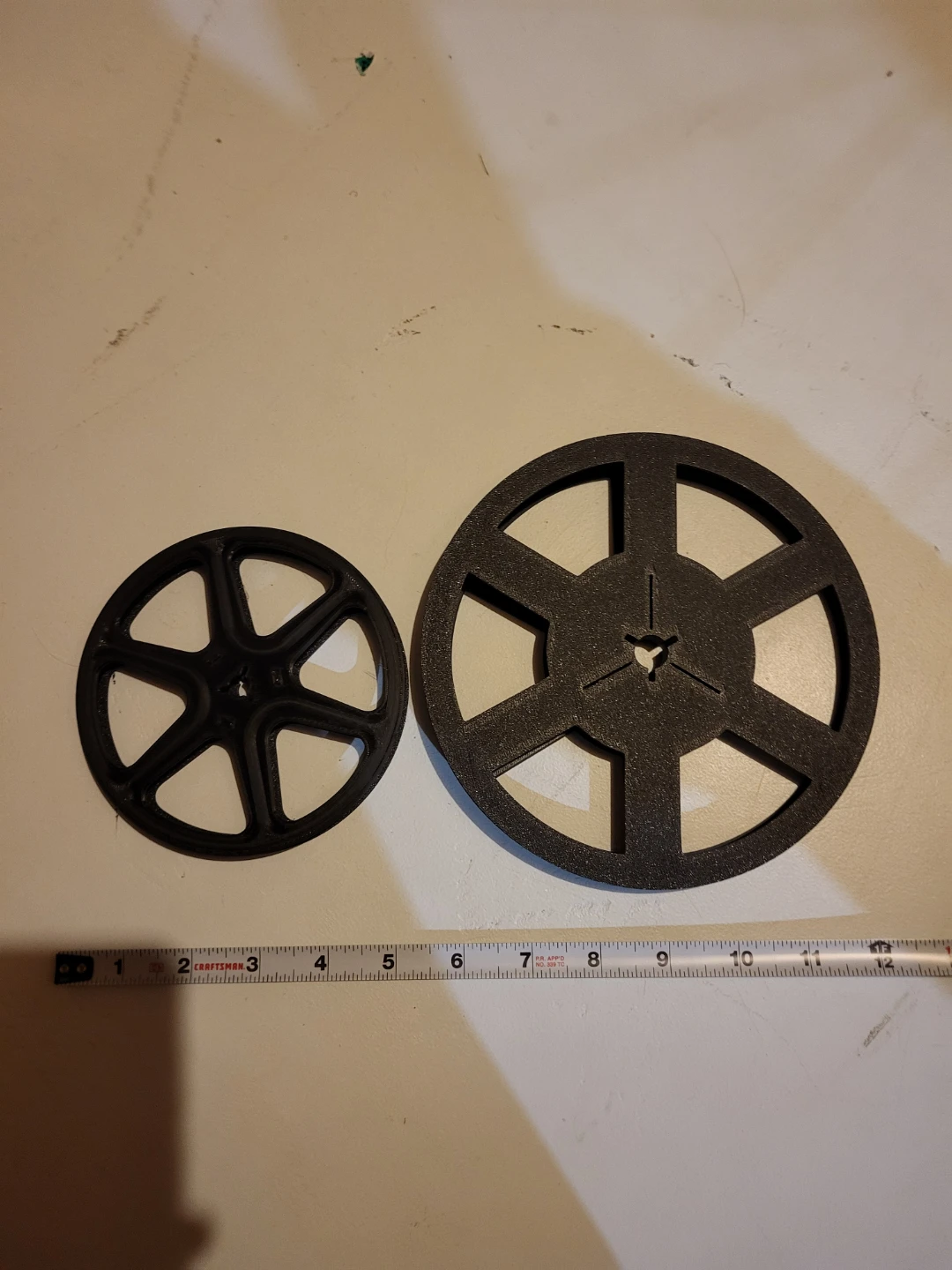 Selling a set of black film reels. They appear to be in good condition and come in two sizes. They both fit together, the larger just needs glue to help it stay stuck. The price is for the smaller one. Larger is twice the cost. Printed to order so I can make as many as you need.