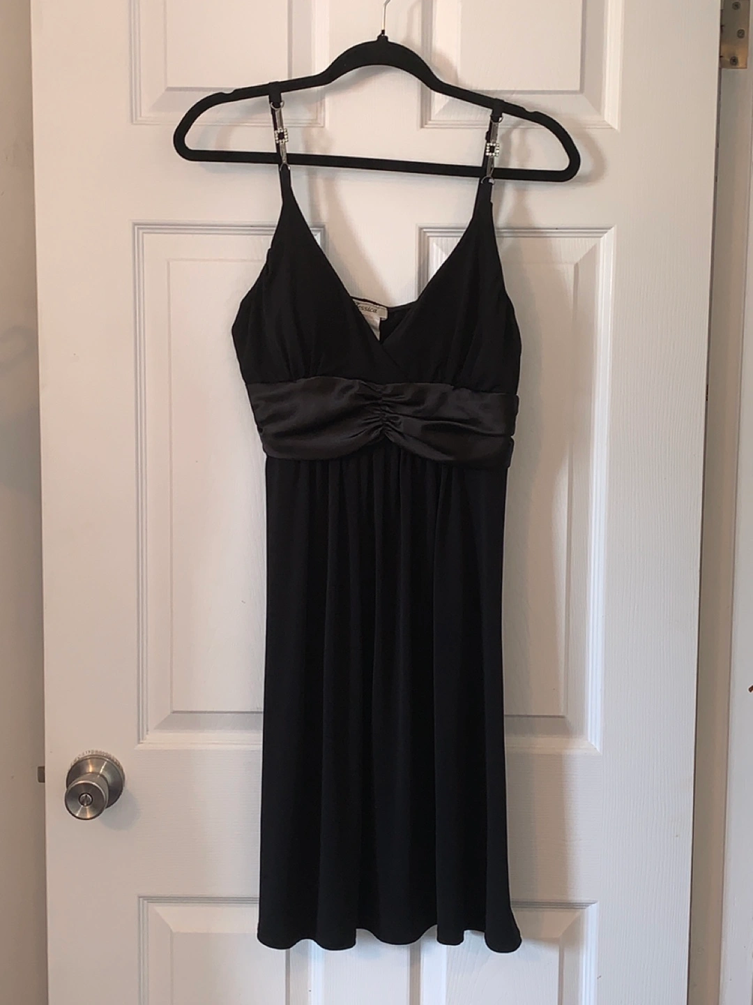 Elegant black dress. Features a V-neckline, empire waist, and adjustable straps. Made of a stretchy, comfortable material. Perfect for a special occasion.