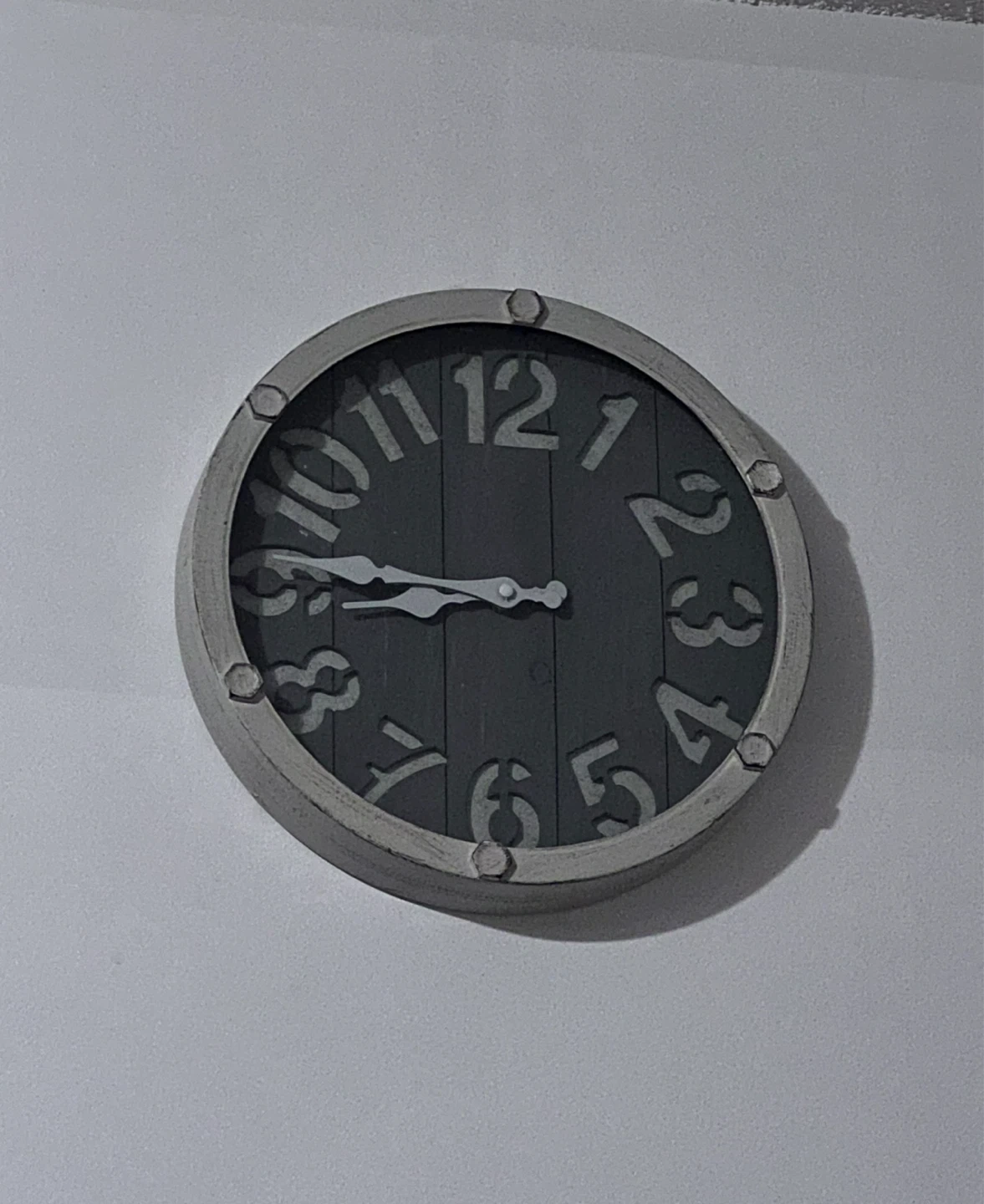This is a round wall clock with a grey distressed frame and a dark grey face. The numbers are raised and have a unique, rustic font. It's perfect for adding a touch of style to any room!