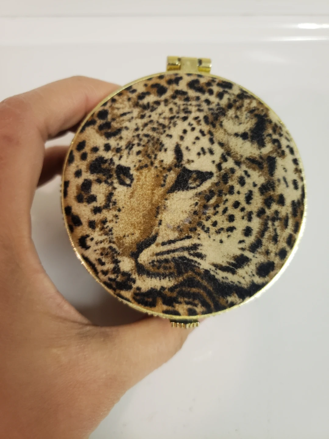 This is a round, decorative trinket box featuring a leopard print design. It opens to reveal a mirror inside the lid and a black velvet-lined interior. It's adorned with ornate gold trim and a decorative jewel.