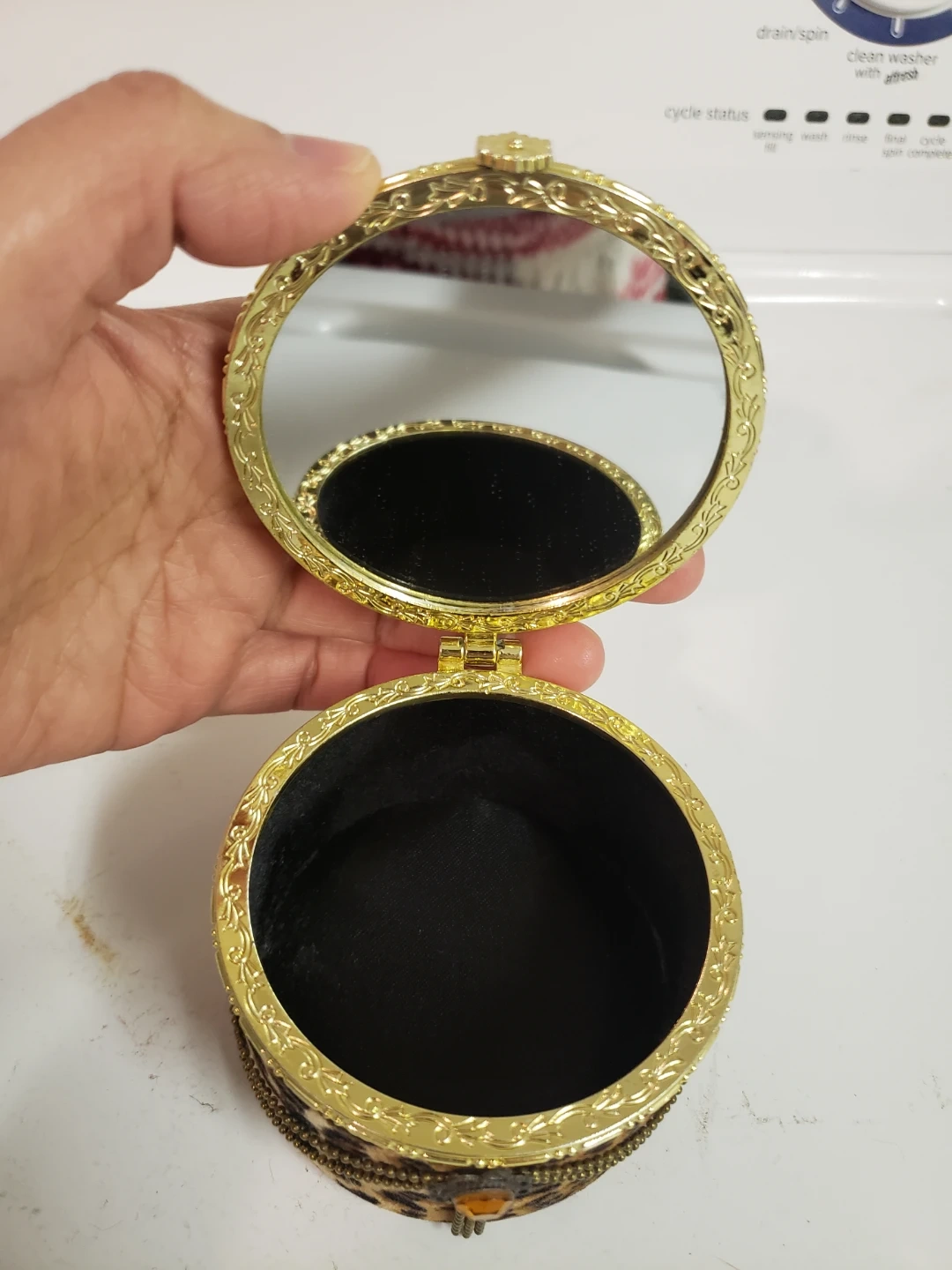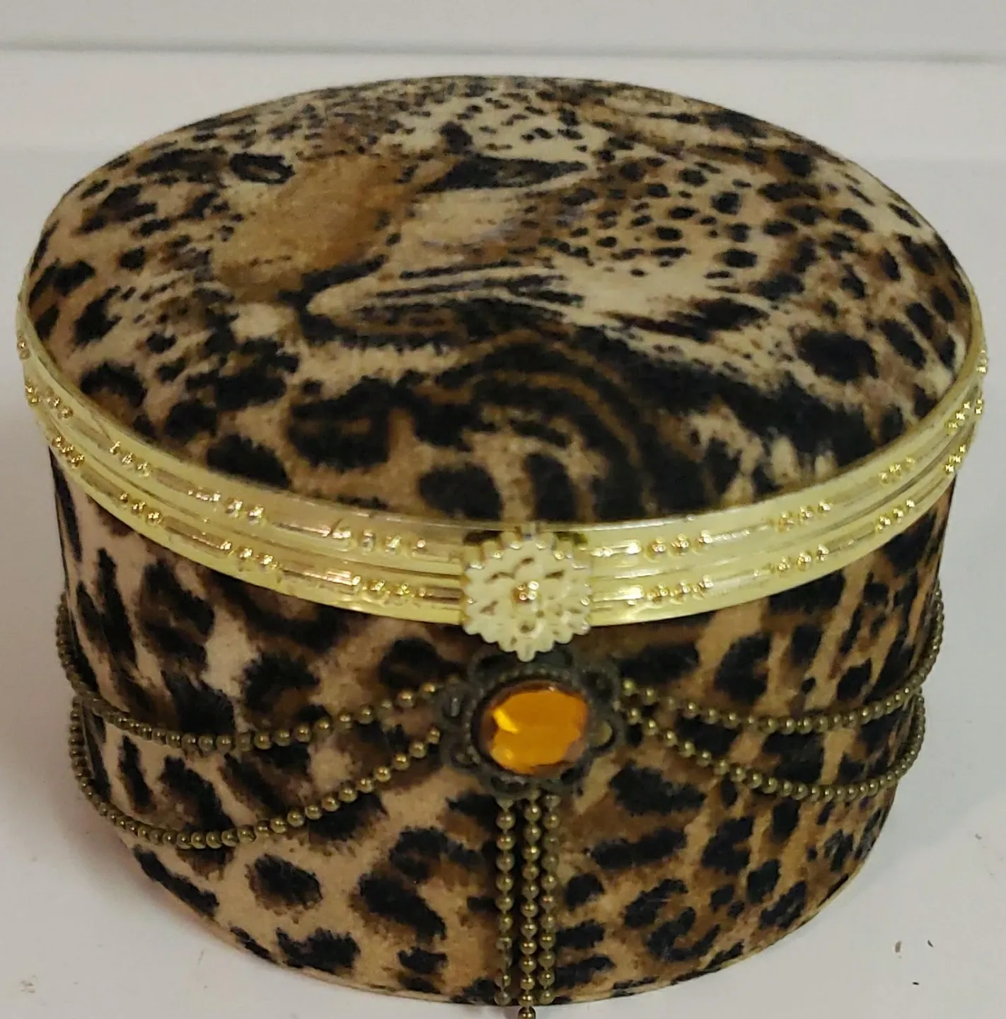 This is a round, decorative trinket box featuring a leopard print design. It opens to reveal a mirror inside the lid and a black velvet-lined interior. It's adorned with ornate gold trim and a decorative jewel.
