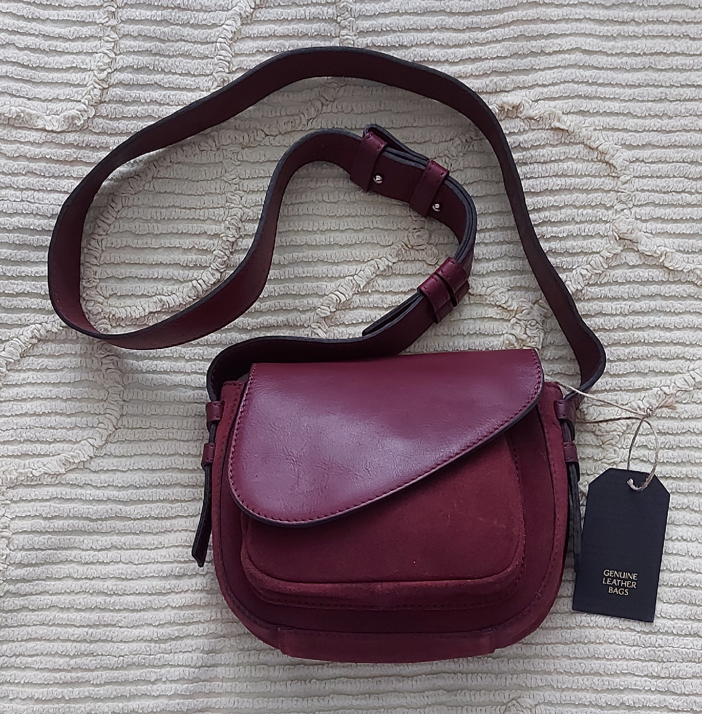 A beautiful burgundy leather crossbody bag! It's brand new and never used and features a stylish design. The bag measures approximately 20cm in length and 15cm in height. Perfect for adding a touch of elegance to any outfit!