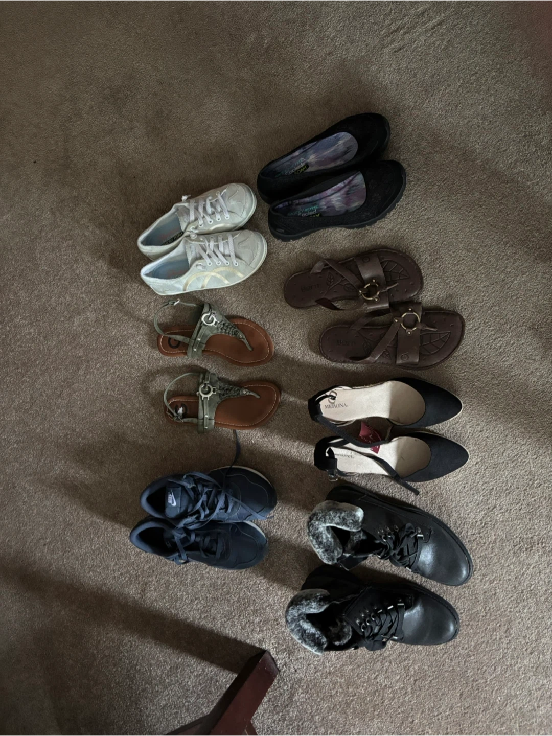 A collection of women's footwear including sneakers, flats, sandals, and boots. Brands include Skechers Nike Guess, Merona.