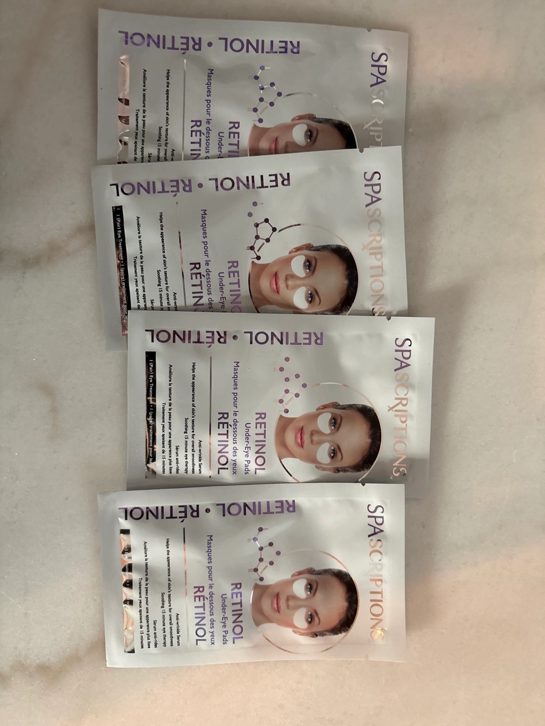 Four SPASCRIPTIONS Retinol Under-Eye Pads included. These are anti-wrinkle serum pads. They offer soothing 15-minute eye therapy for smoother skin. Use for a 15-minute treatment.