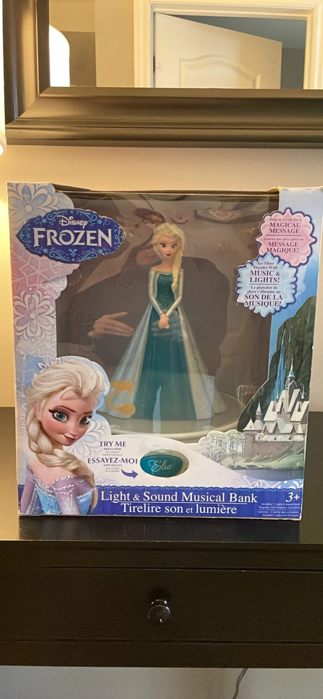 Light and sound musical bank. Features Elsa. Plays music. Ice floor sparkles with lights. Drop in a coin for a magical message. For ages 3+ English & French