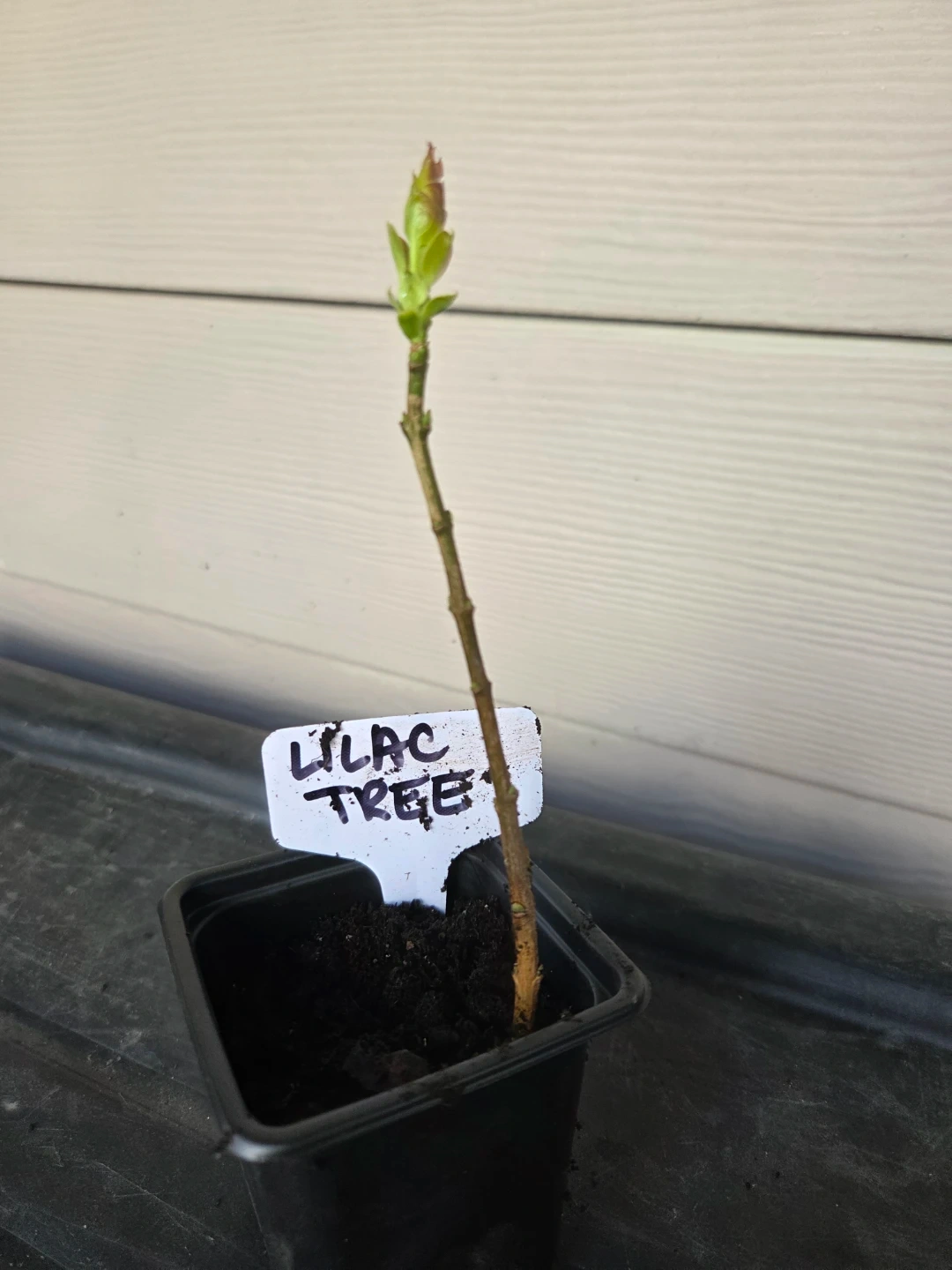 A young lilac tree sapling potted in soil. It's ready to be transplanted and grow into a beautiful flowering shrub. This plant would be a great addition to any garden for fragrant blooms.