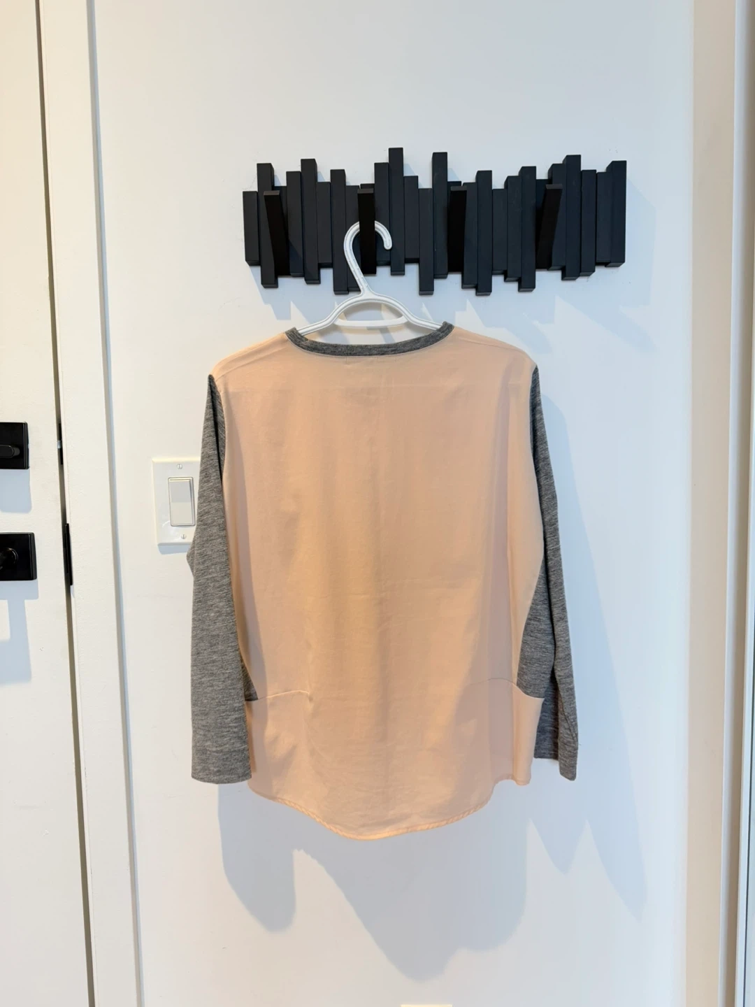 Selling a long Sleeve top. It's a size small and features a unique colour block design with a peach body that’s in silk and grey sleeves. Great for everyday wear