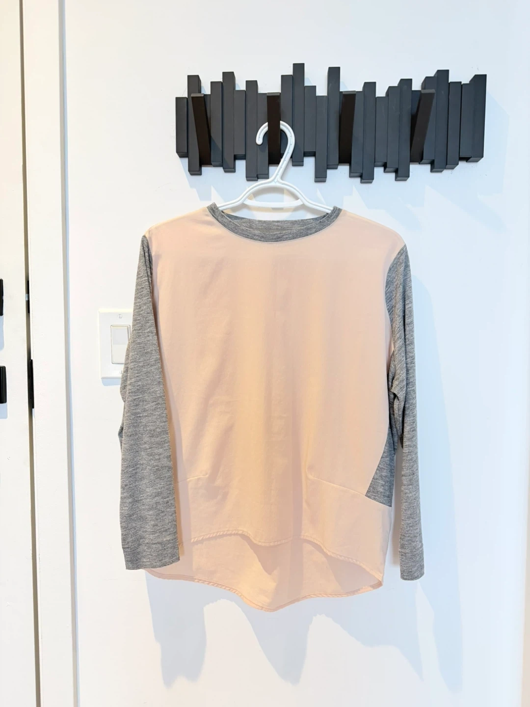 Selling a long Sleeve top. It's a size small and features a unique colour block design with a peach body that’s in silk and grey sleeves. Great for everyday wear