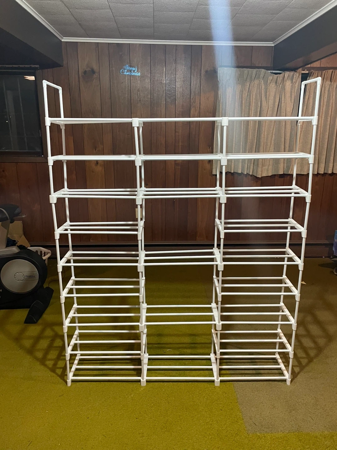 I'm selling a white 9-tier shoe rack organizer. It's perfect for keeping your shoes neat and tidy. The dimensions are approximately 68.5" tall, 51" wide, and 12" deep. It's a great way to maximize your storage space