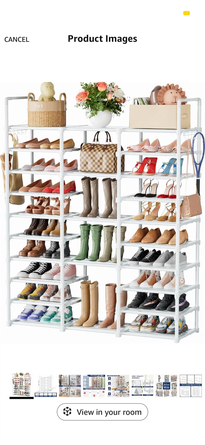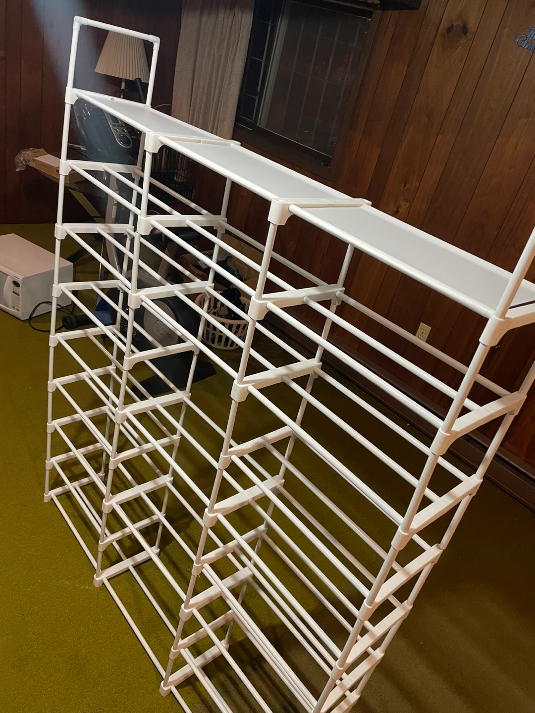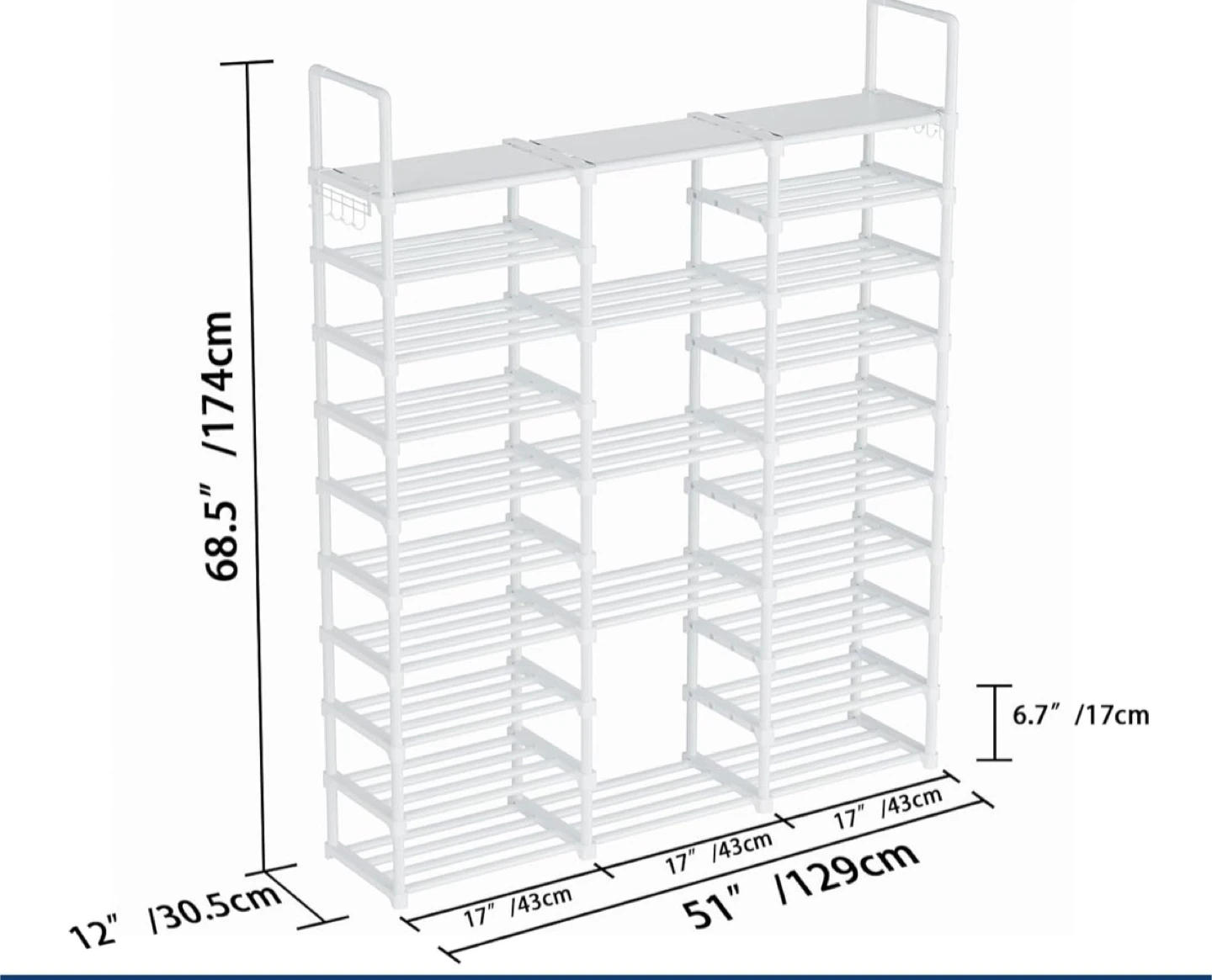 I'm selling a white 9-tier shoe rack organizer. It's perfect for keeping your shoes neat and tidy. The dimensions are approximately 68.5" tall, 51" wide, and 12" deep. It's a great way to maximize your storage space