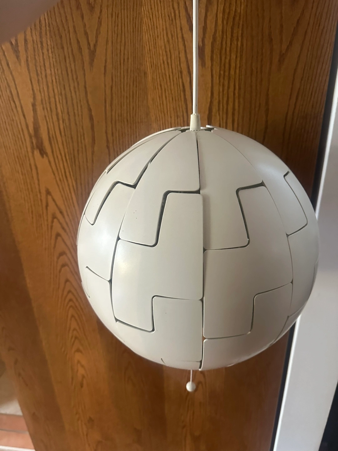 White pendant lamp. Sphere shape. Pull chain. Good condition.