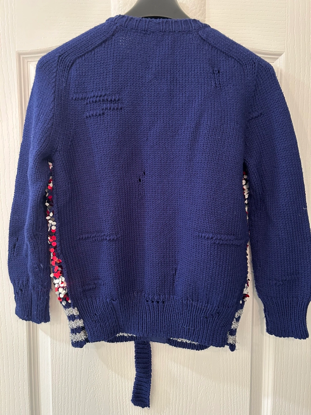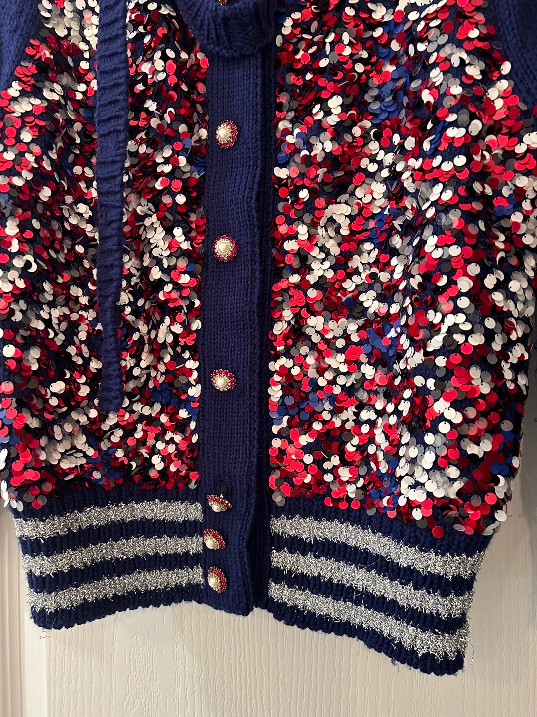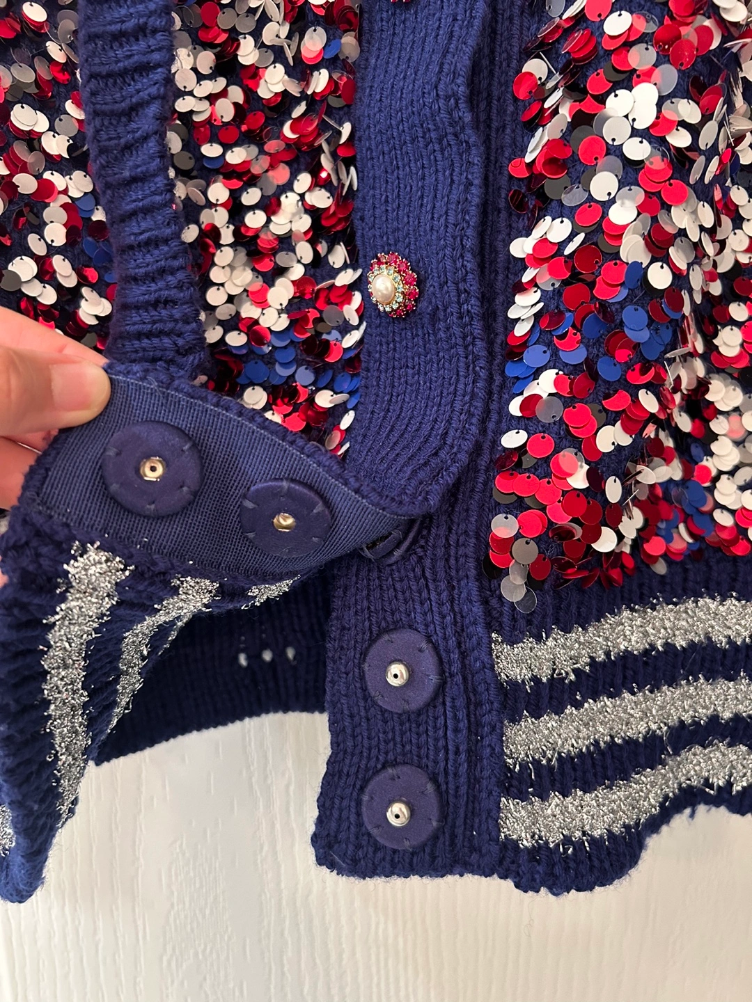 Navy blue cardigan with red, white and blue sequins. Size XS. Has silver stripe detailing and pearl-like buttons.