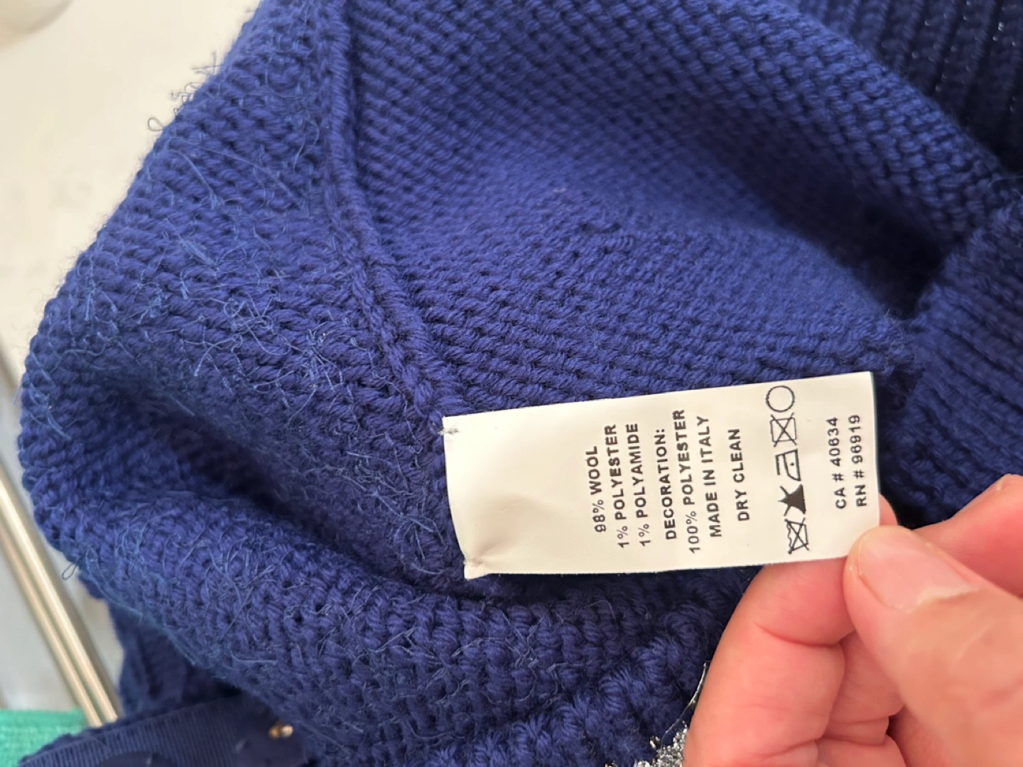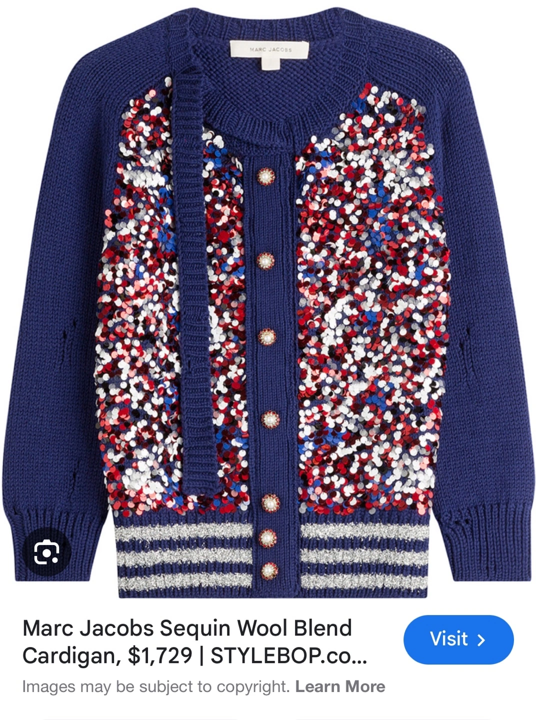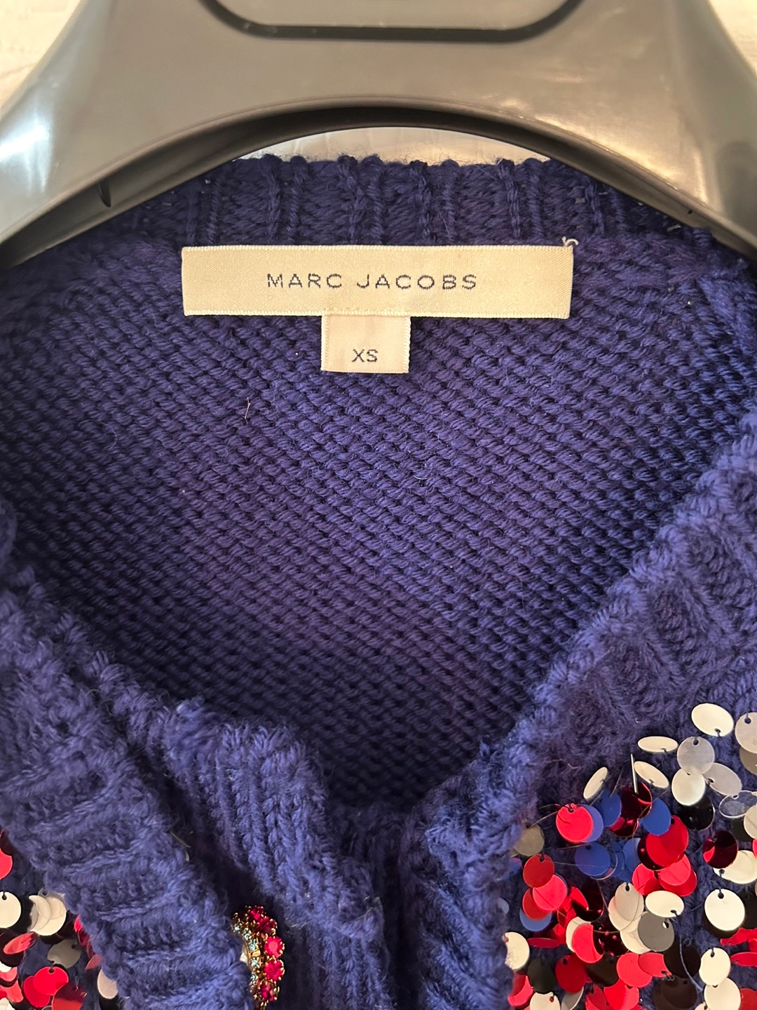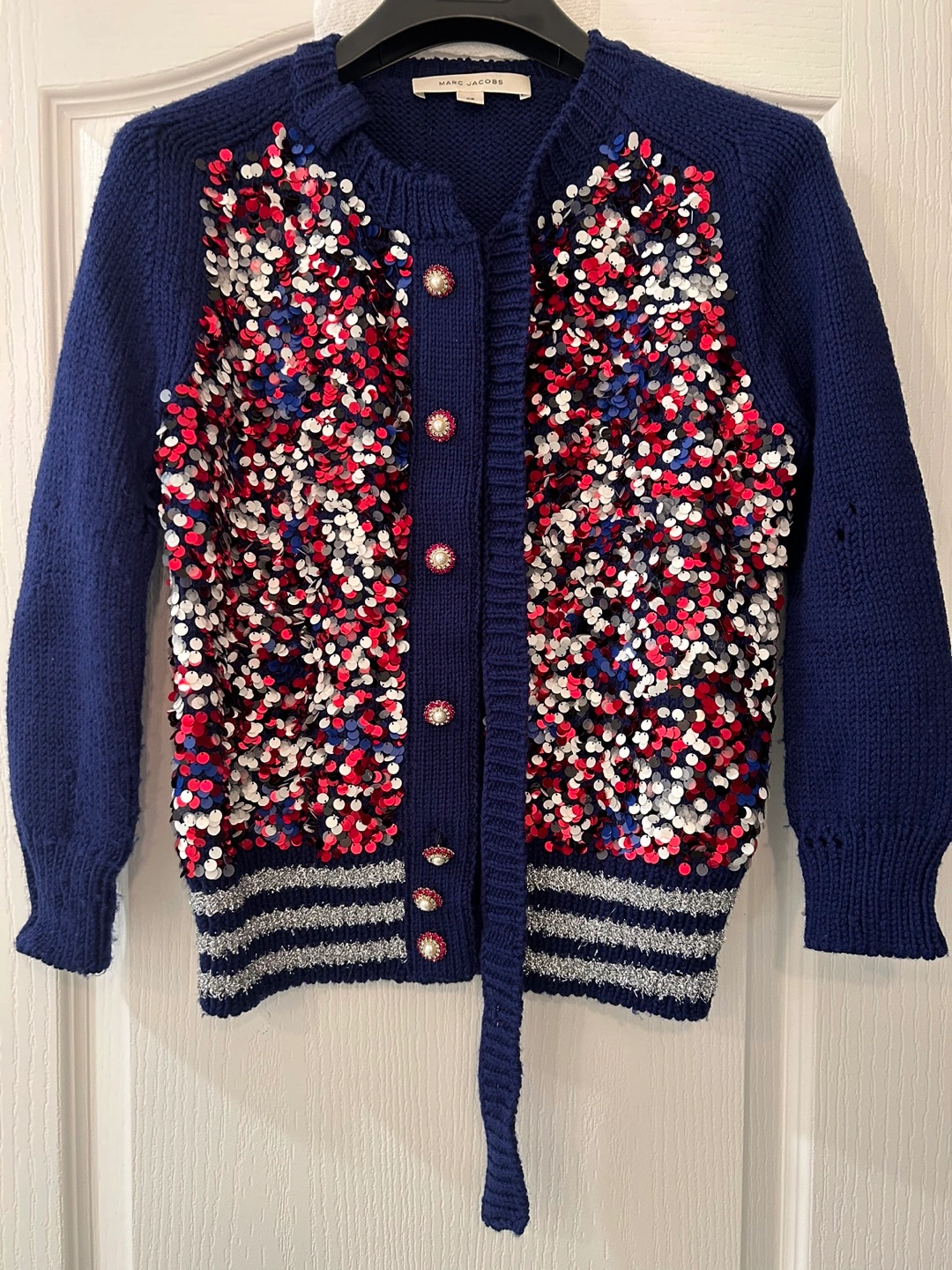 Navy blue cardigan with red, white and blue sequins. Size XS. Has silver stripe detailing and pearl-like buttons.