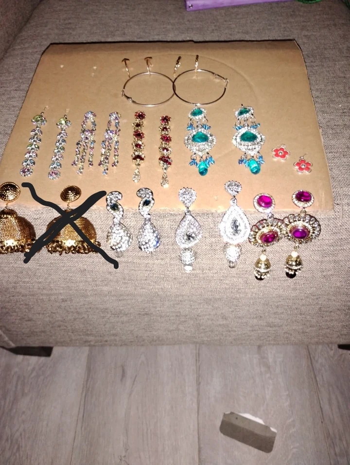 This is a collection of decorative drop earrings. It includes various styles with rhinestones, faux gems, and gold-tone finishes. Designs range from dangly chandelier styles to stud-like danglers.