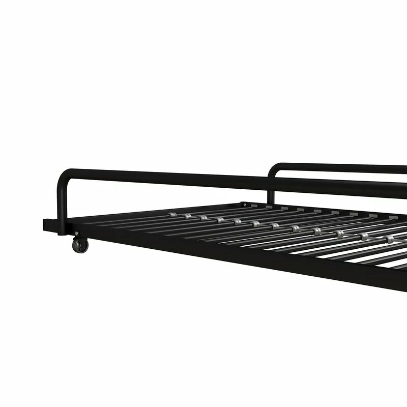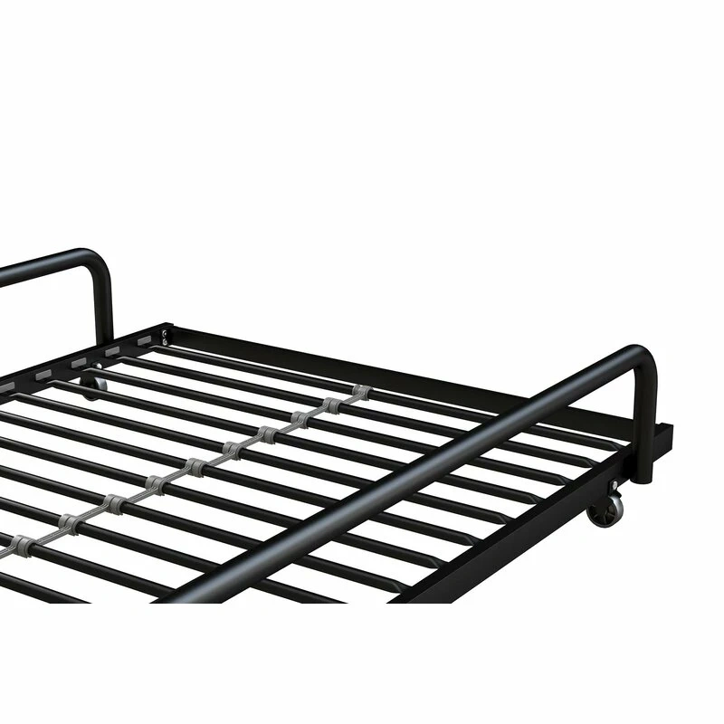 Single bed, trundle base, black metal frame, with rails and wheels that can be locked. New, no wear. Doesn't squeak.