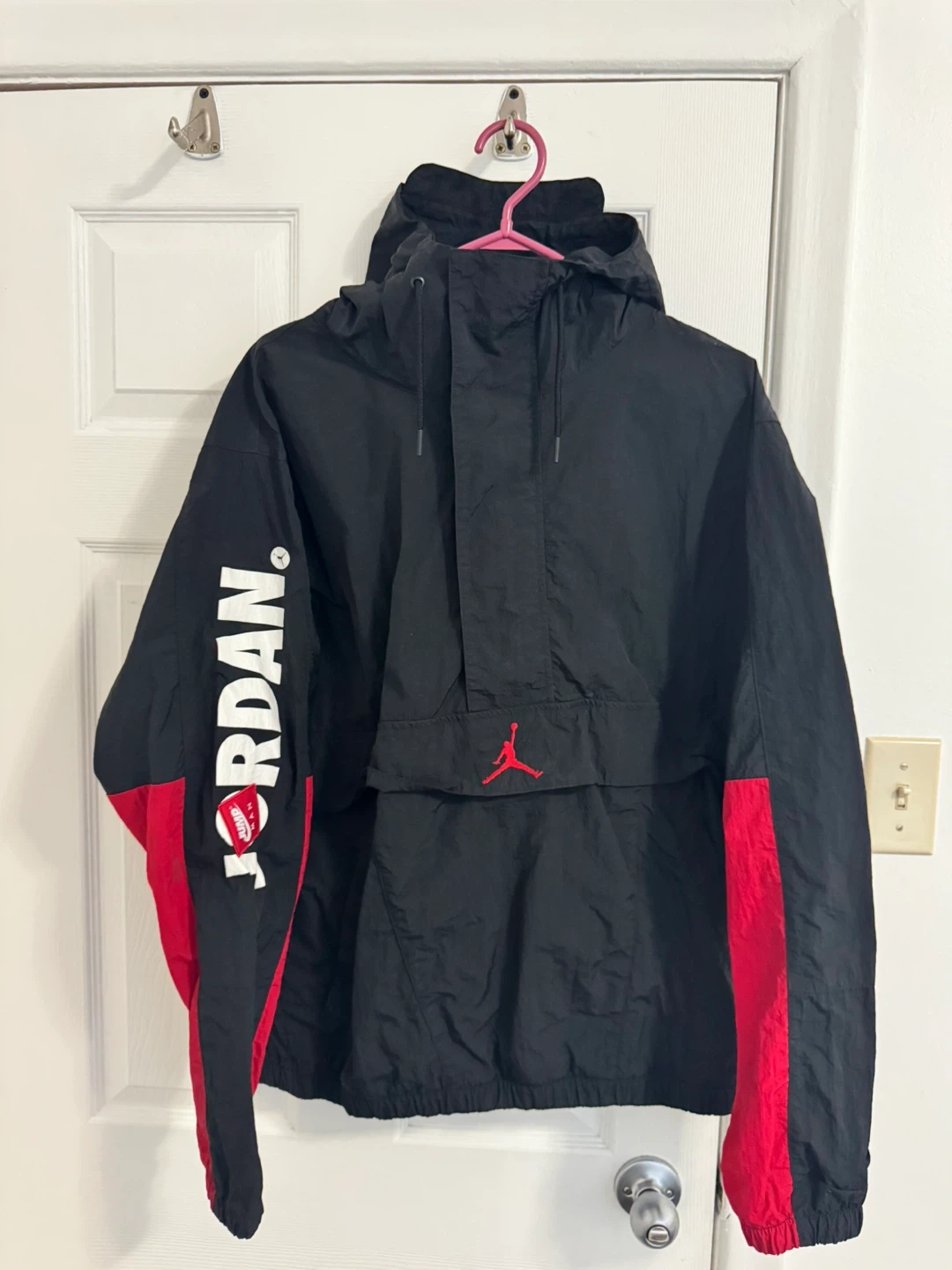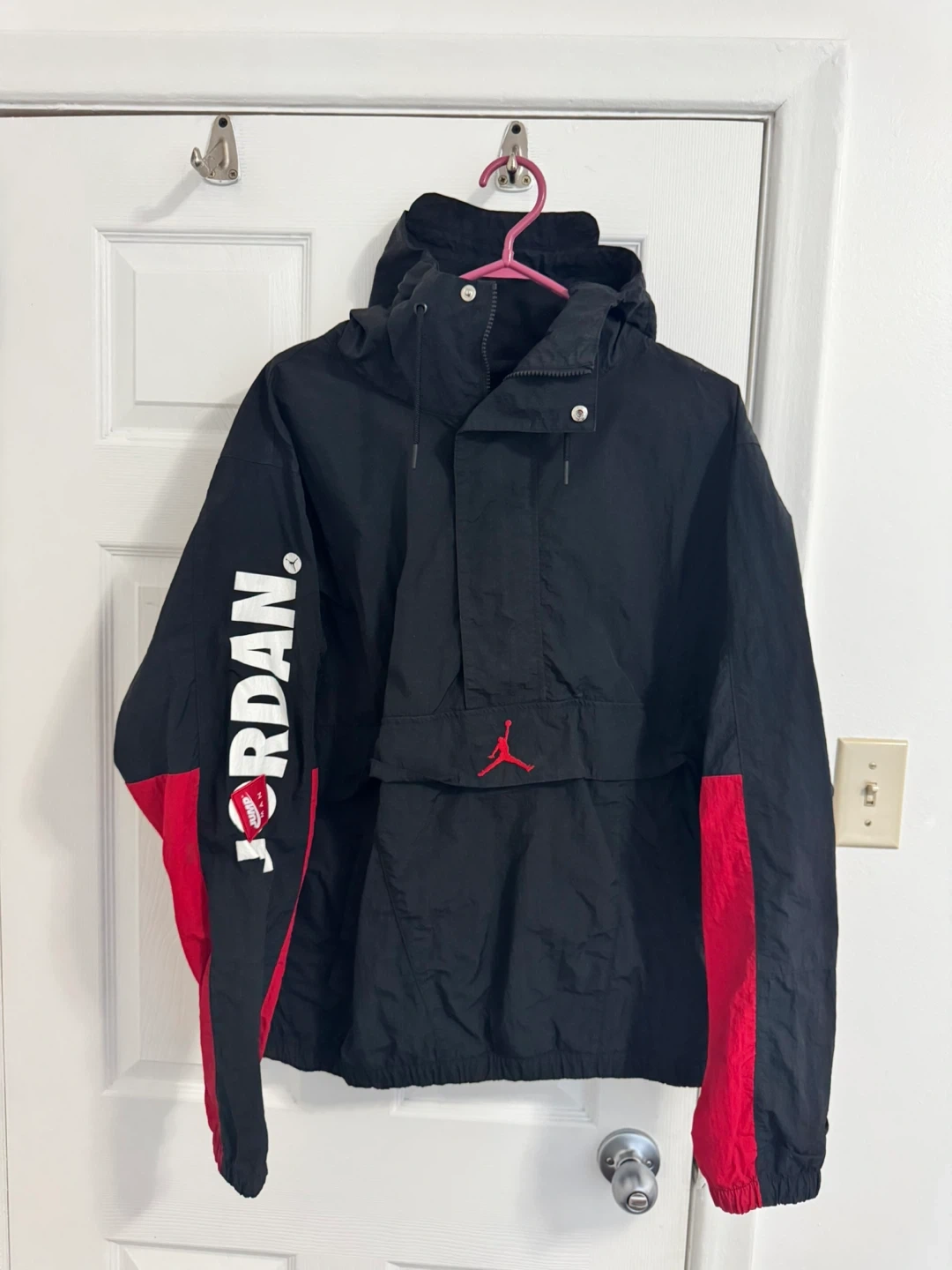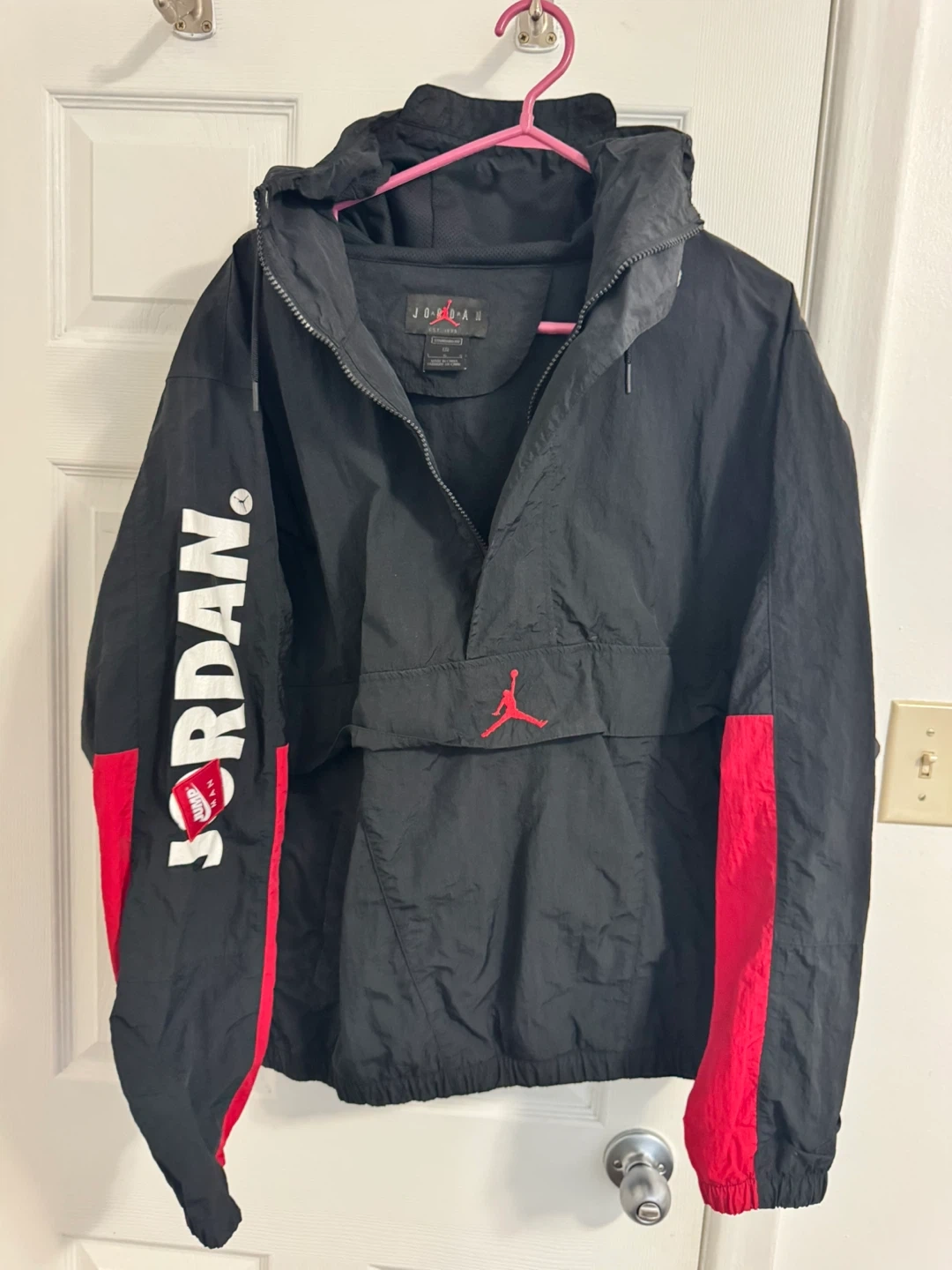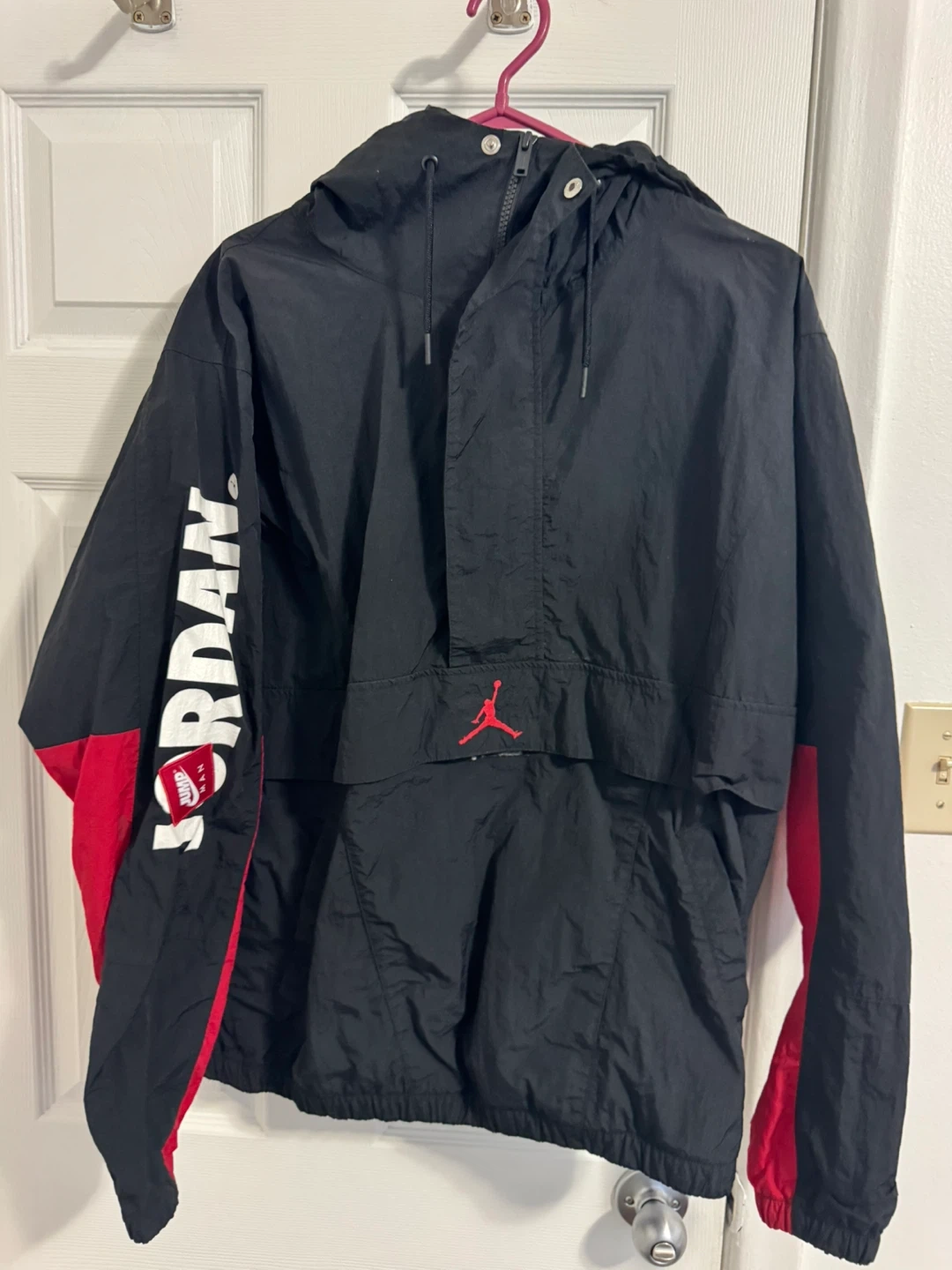 Selling a Jordan anorak jacket in black and red! It's a size large and in great condition. Features the Jordan logo and a stylish design. Perfect for everyday wear or sports activities!