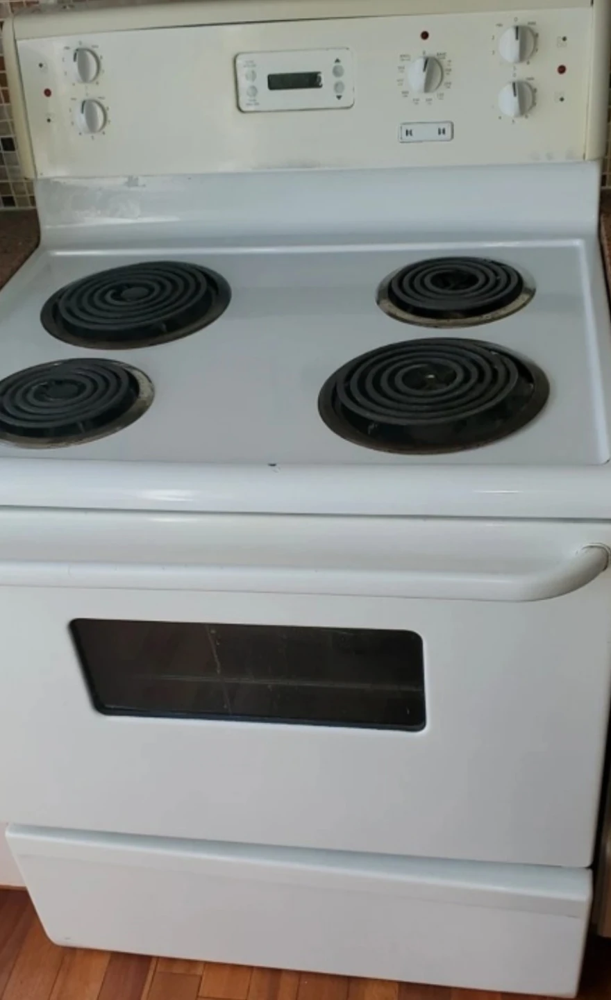 This is a white electric stove with four coil burners on top. It includes an oven with a glass window. The control panel has knobs and a digital display.