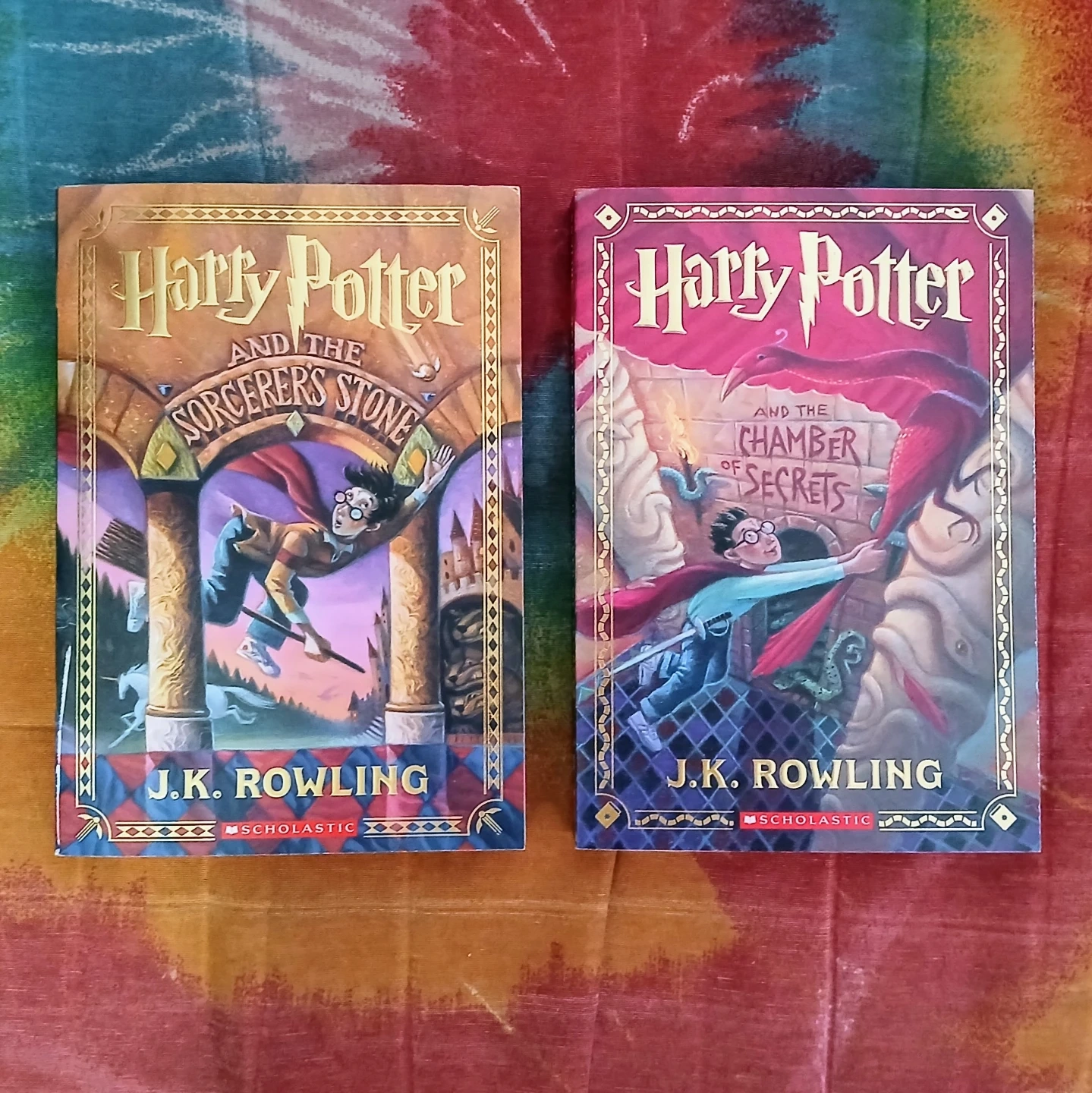 Two Harry Potter books. The first one titled Harry Potter and the Sorcerer's Stone and the second one titled Harry Potter and the Chamber of Secrets. Reading these books is a great way to relax and unwind after a long day.