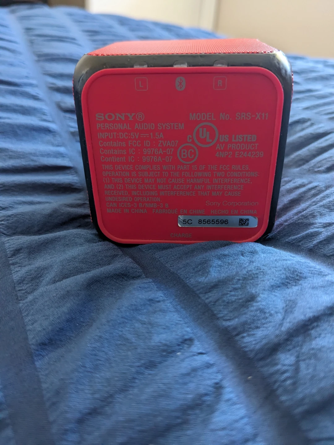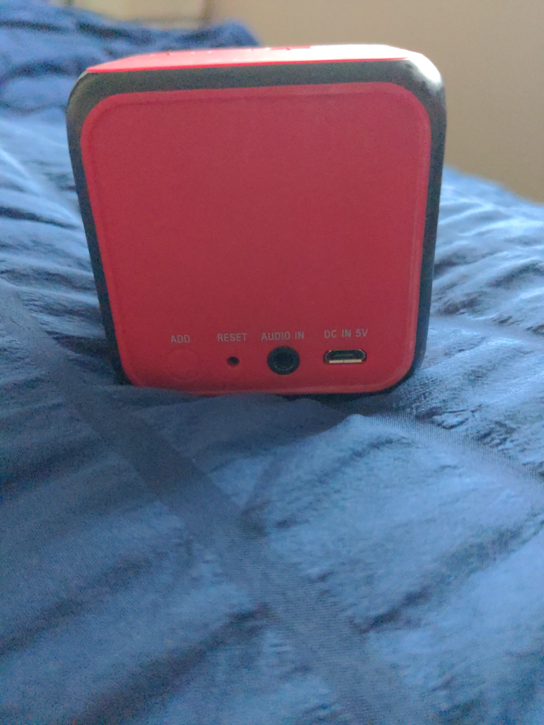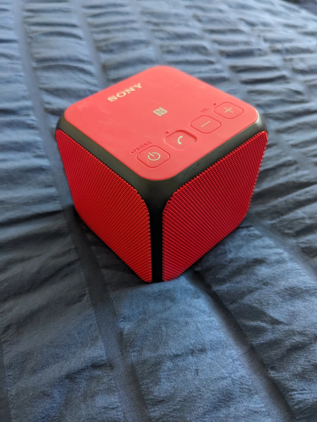 Red Sony personal audio system. It's a portable Bluetooth speaker with audio in and 5V DC in ports. Great for on-the-go listening!