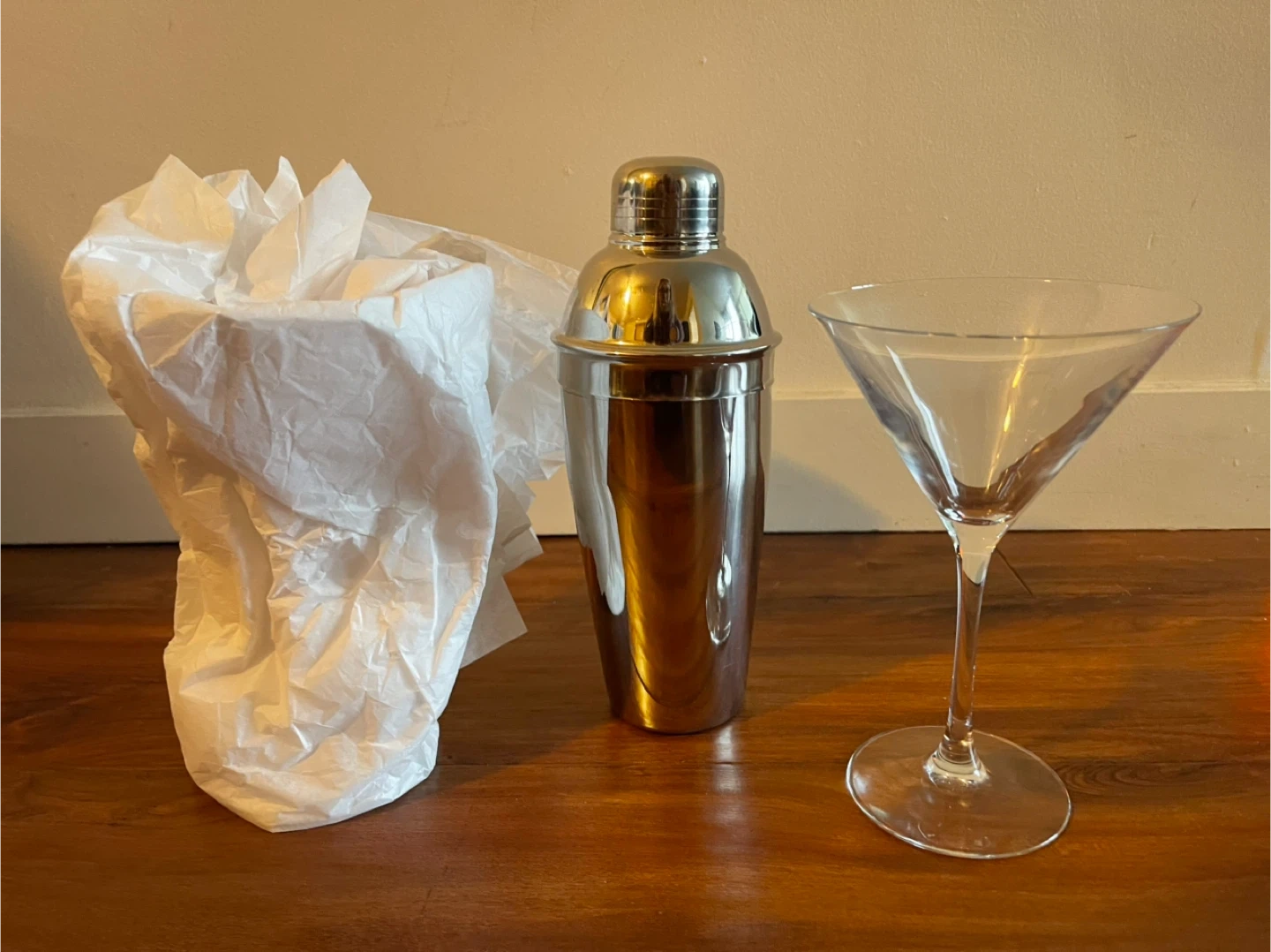 This set includes a stainless steel cocktail shaker and two clear martini glasses. (Carefully wrapped for transport)