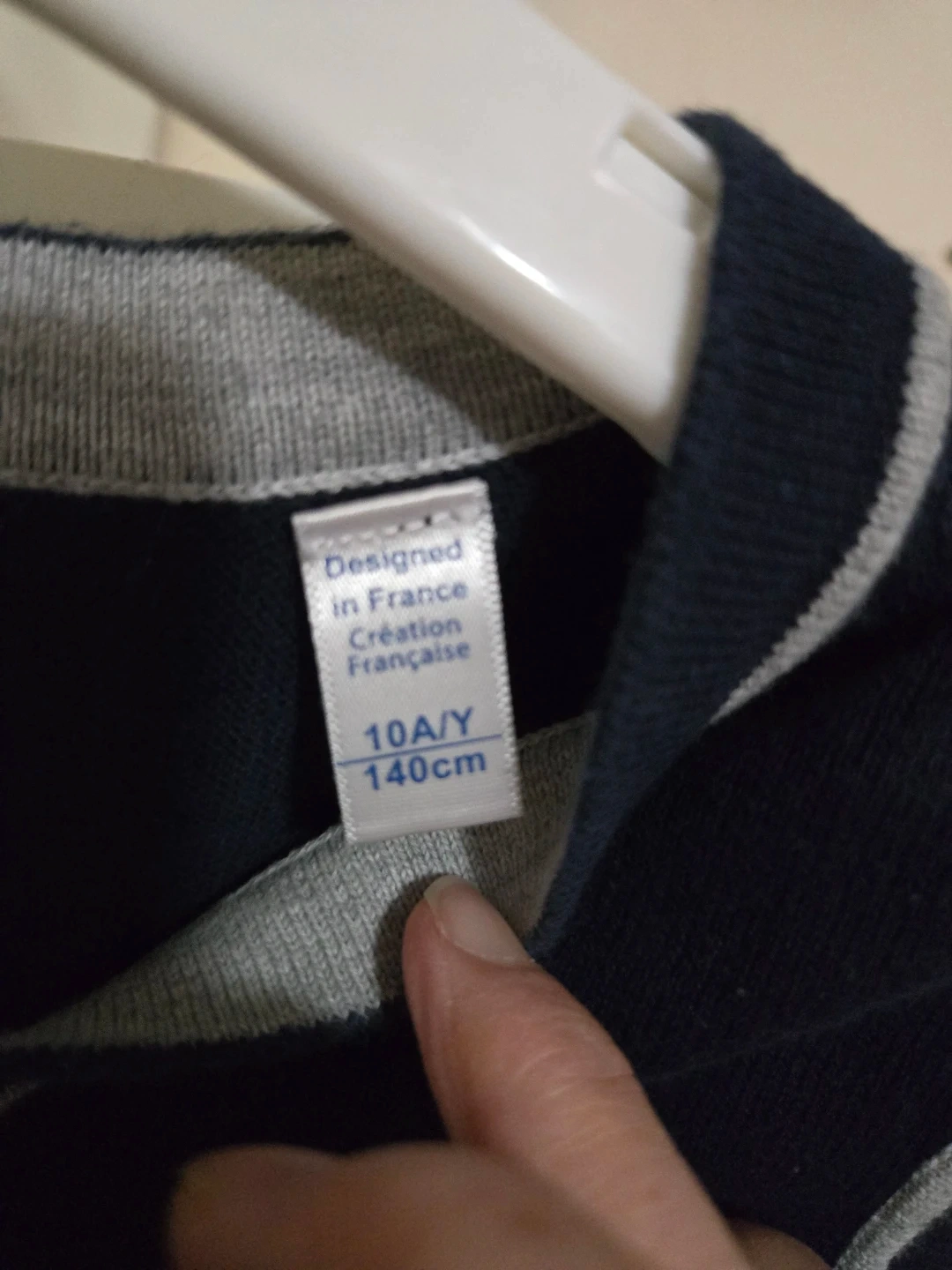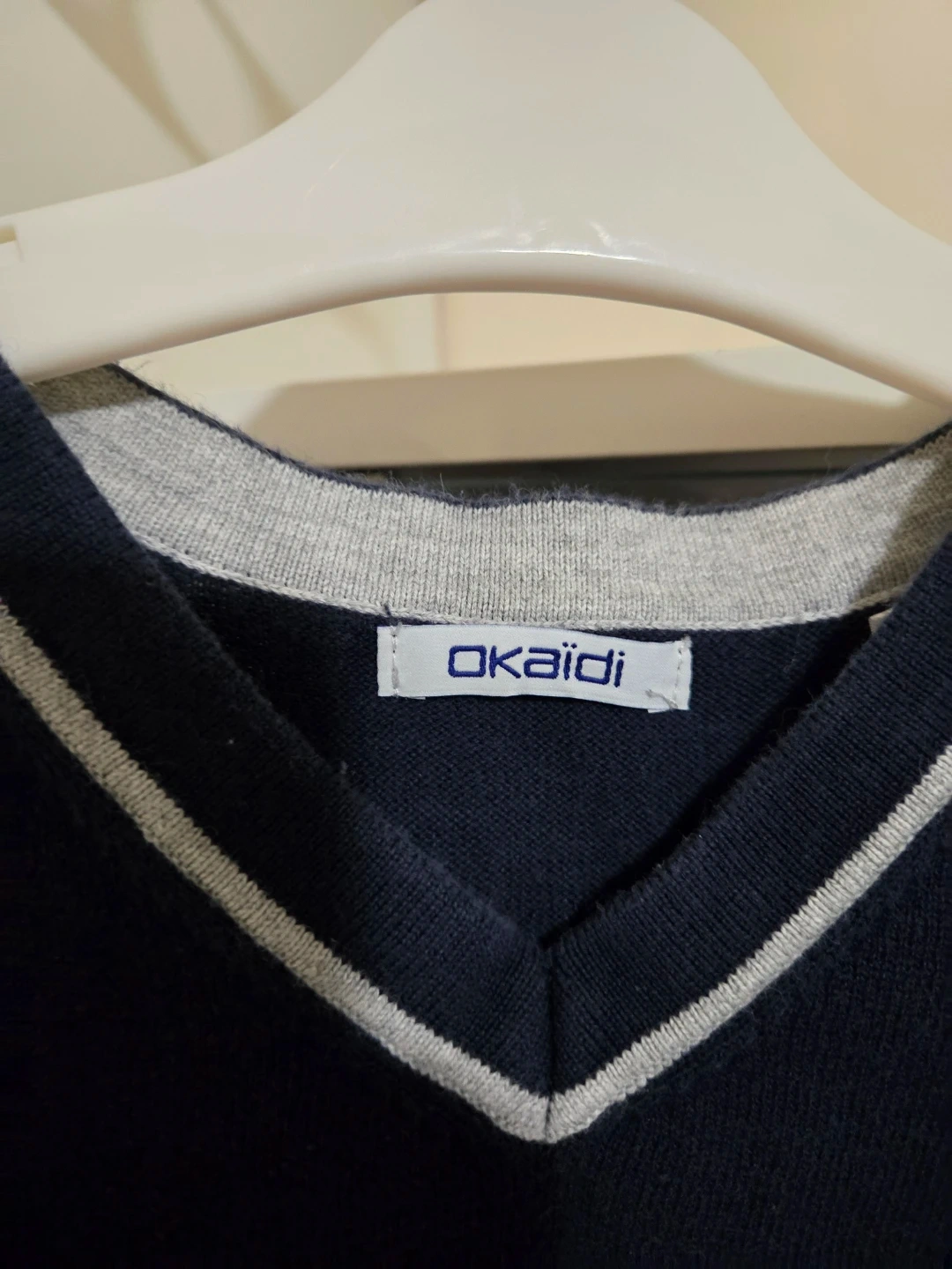 I'm selling a gently used Okaidi vest. It's a navy blue colour with a classic V-neck design and grey trim. The size is 10A/Y or 140cm. Perfect for layering!