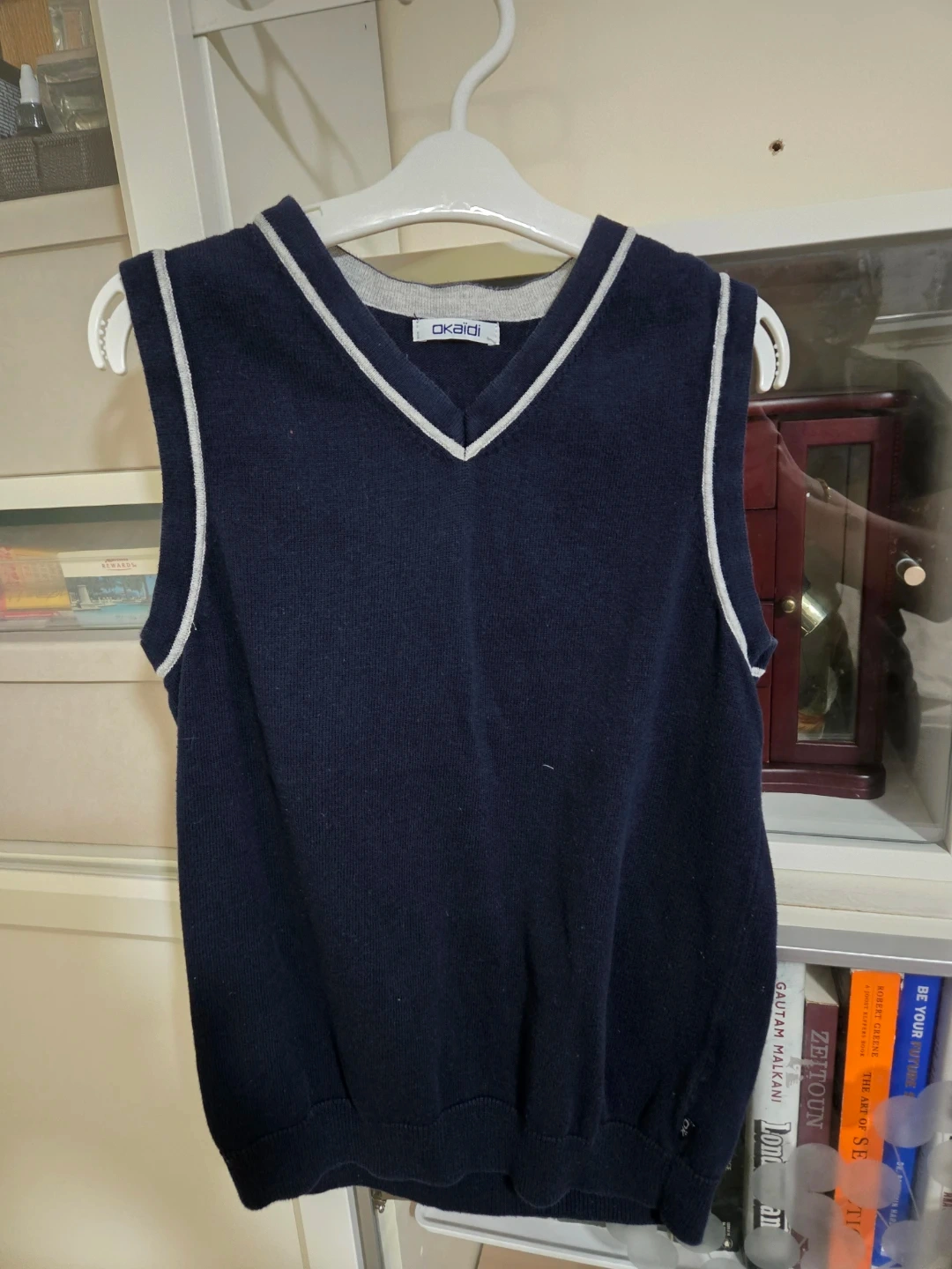 I'm selling a gently used Okaidi vest. It's a navy blue colour with a classic V-neck design and grey trim. The size is 10A/Y or 140cm. Perfect for layering!