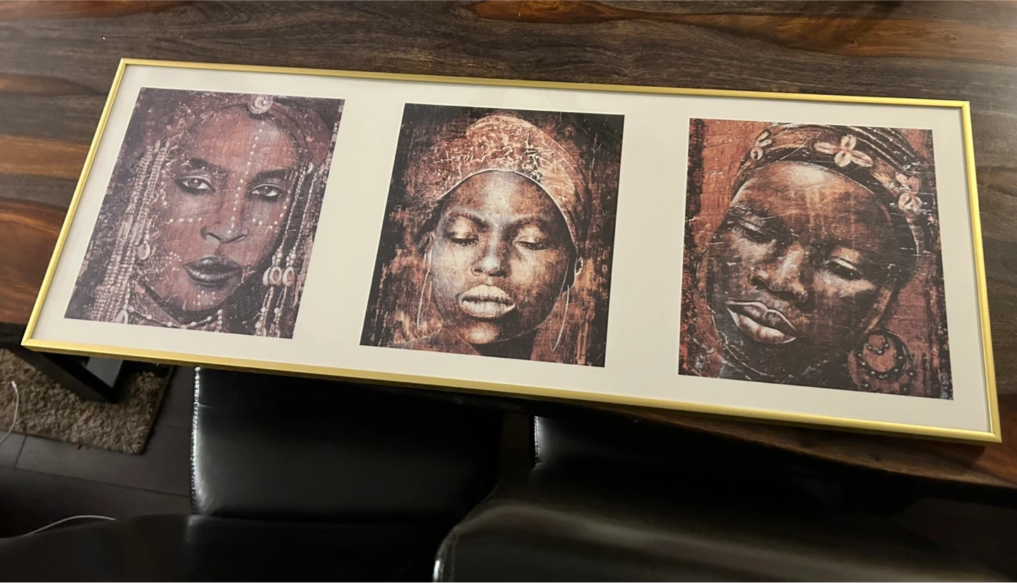 Beautiful framed triptych featuring portraits of African women. The artwork is in great condition and ready to add a touch of elegance to your home decor