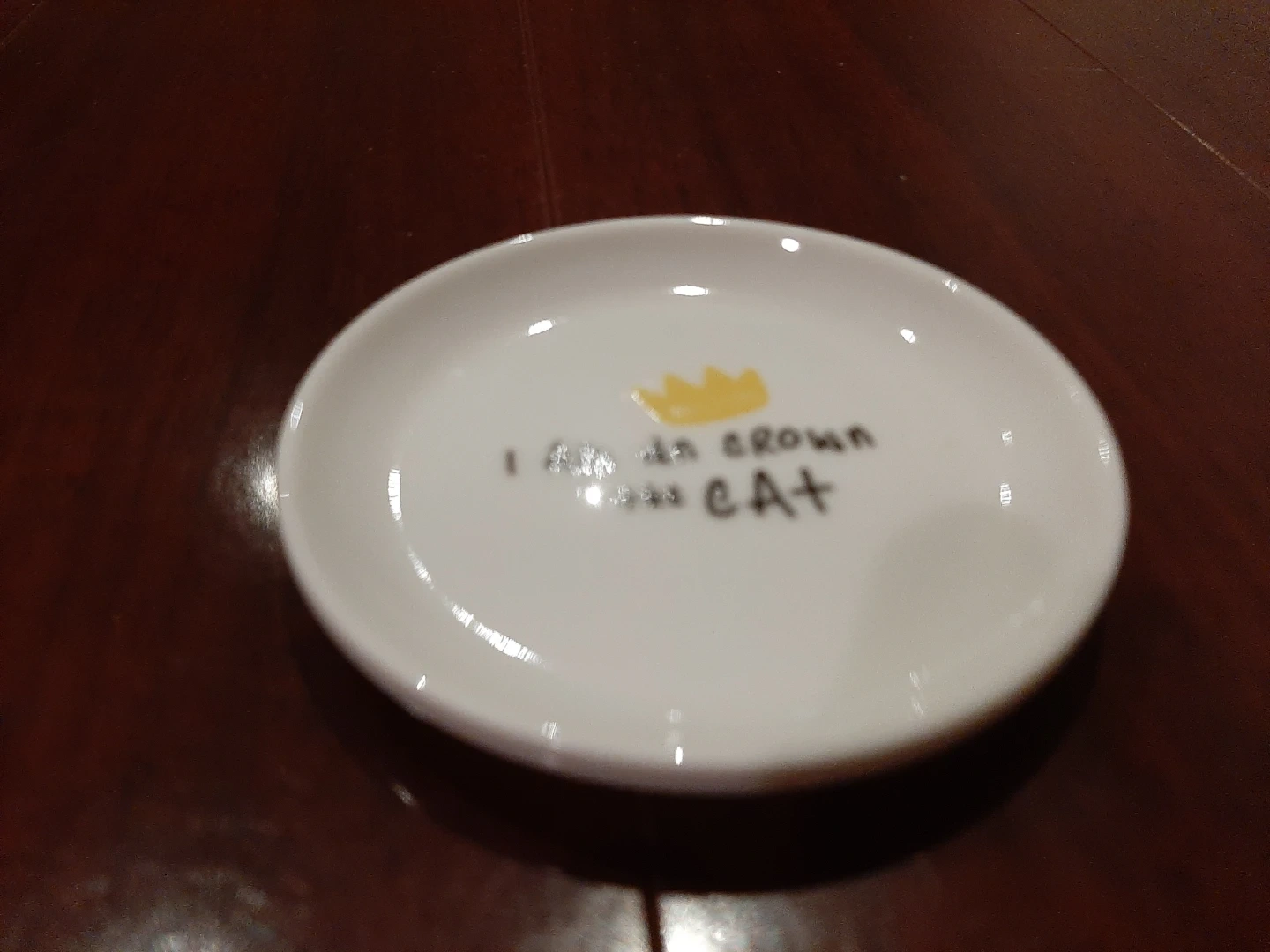 This is a cute small ceramic dish designed for cats. It features the text 'I AM An crown the CAT' with a yellow crown graphic. Perfect for your feline friend's cat treats!