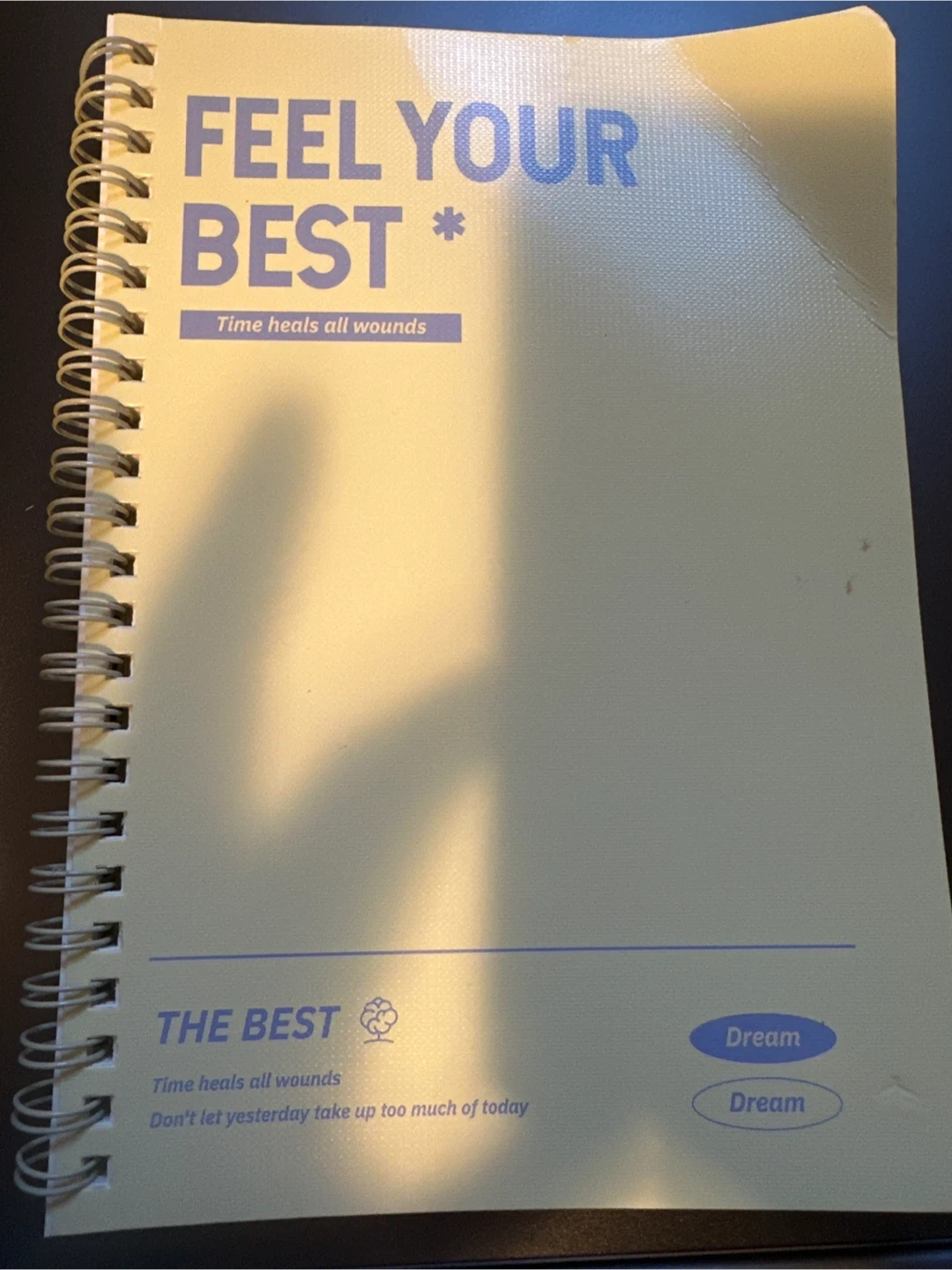 This is a spiral-bound notebook with motivational phrases. It says 'Feel Your Best' and 'The Best' on the cover. It has a light yellow textured cover and a blue spiral binding. The journal has two blue oval buttons that say 'Dream'.