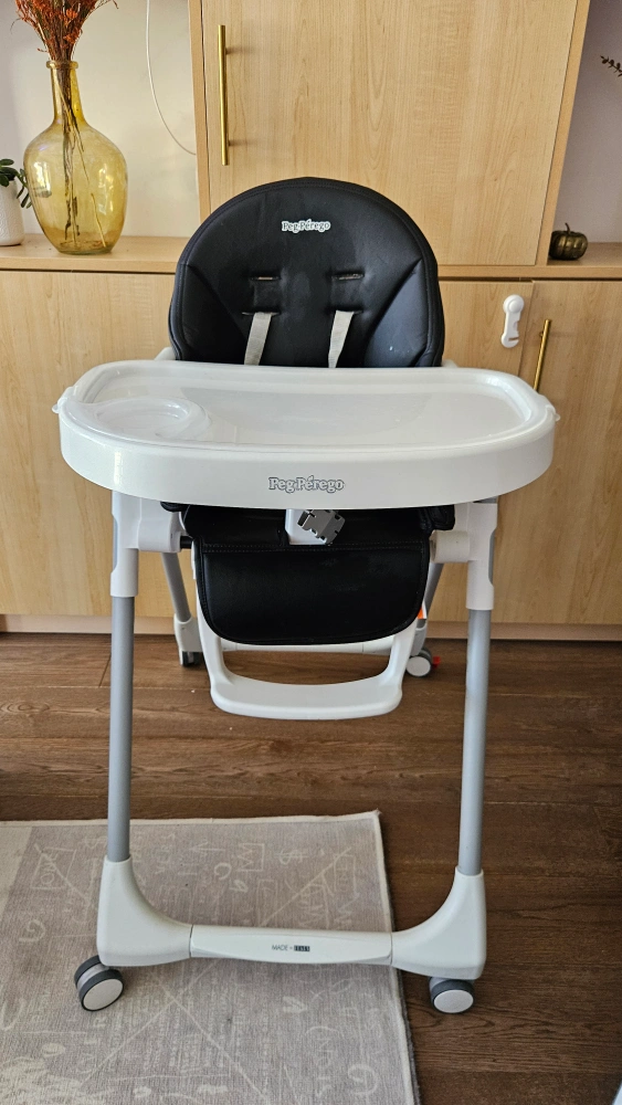 This Peg Perego high chair features a Prima Pappa Zero 3 model. It has a black seat and white tray, with a durable frame and wheels for easy movement. The seat is made of faux leather. It's suitable for mealtimes and playtime for young children.