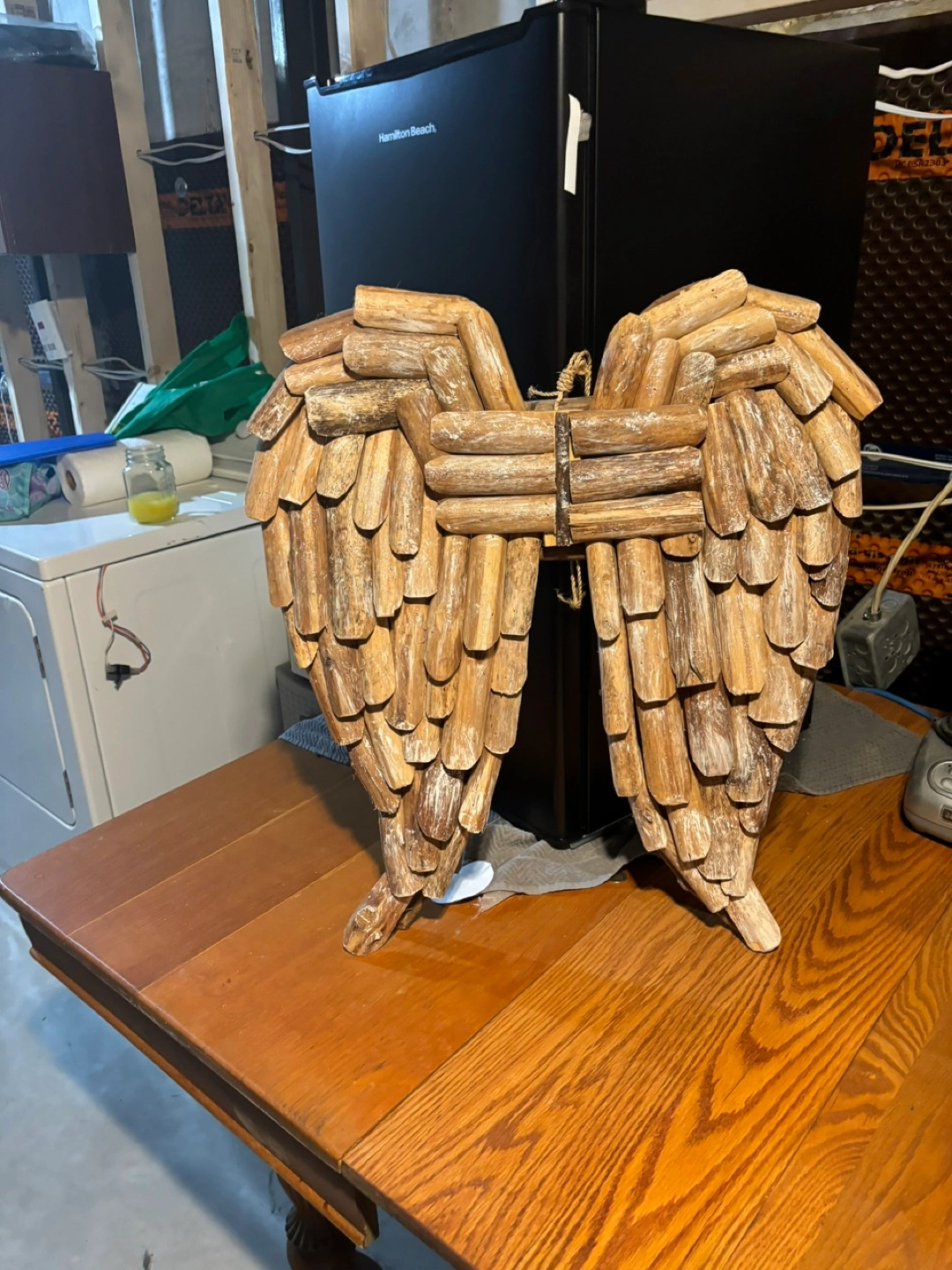 Large decorative angel wings. Made of wood, light brown colour. Distressed finish. Great for adding a rustic touch to your home decor.