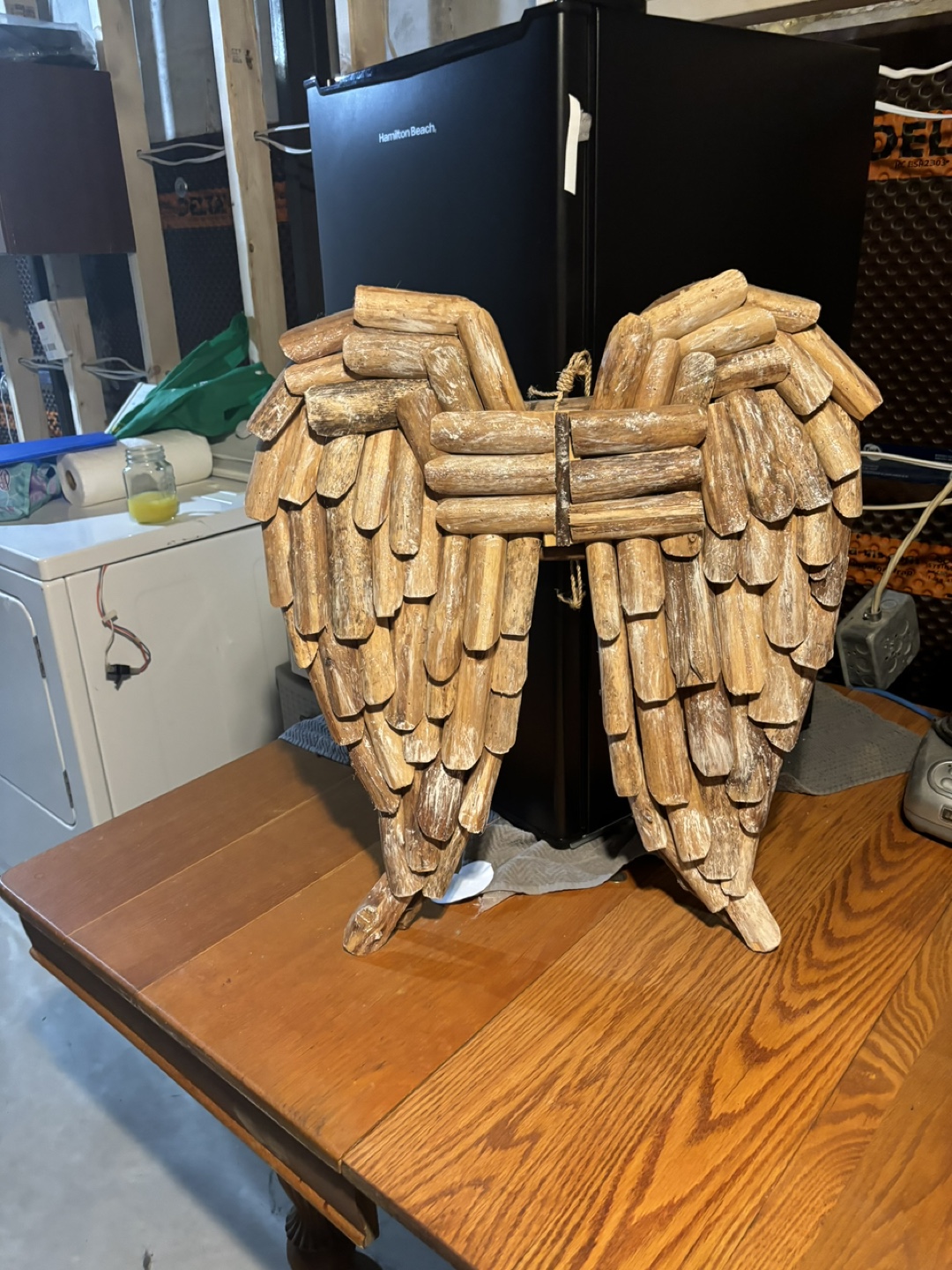 Large decorative angel wings. Made of wood, light brown colour. Distressed finish. Great for adding a rustic touch to your home decor.
