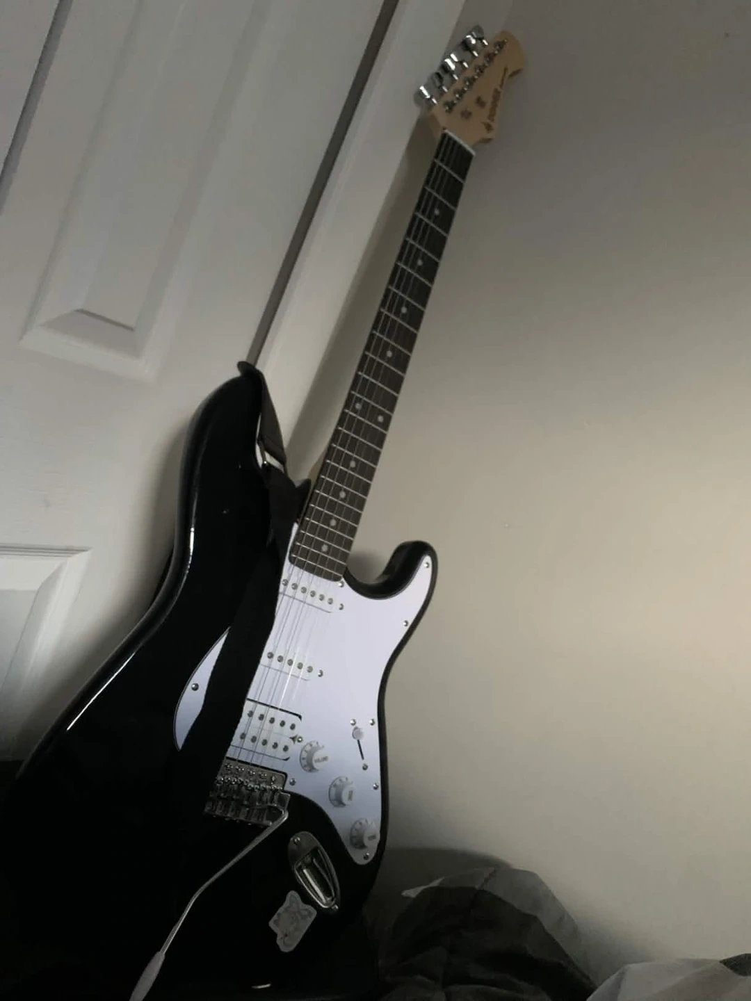 This is a Donner electric guitar. It's black with a white pickguard. Great condition. Comes with a free guitar bag. Can add a small amp, strings, and electric guitar aux cable for an extra $10.