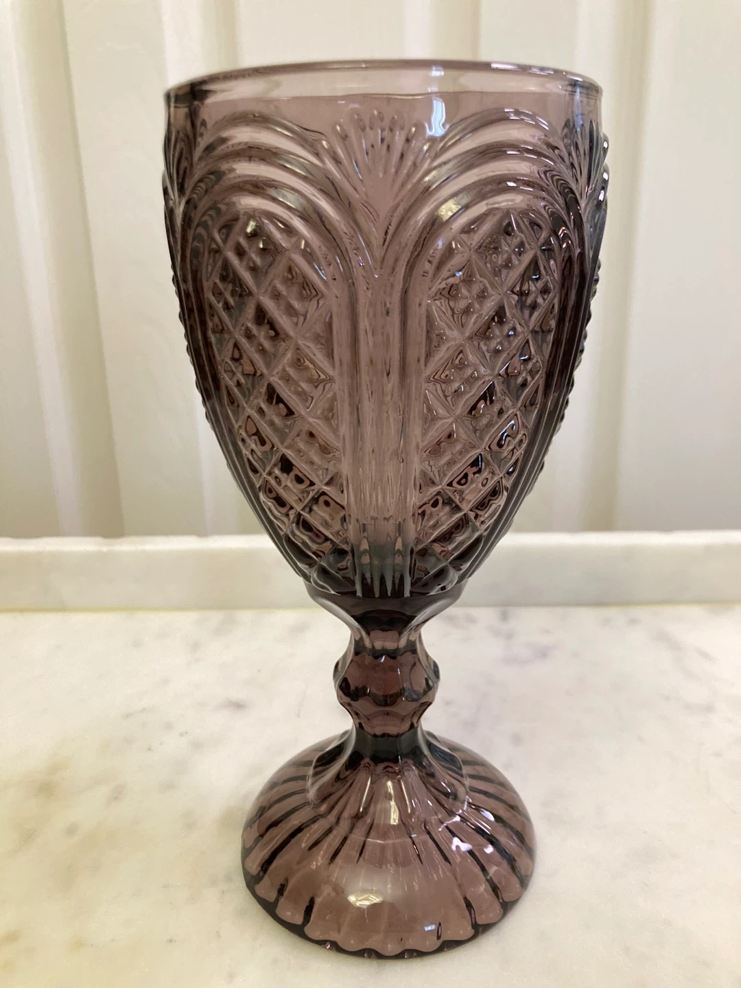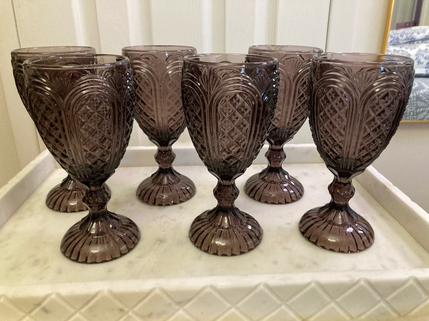 This set includes six beautiful vintage cut glass goblets. They're made of a smoky amethyst colored glass with intricate diamond and fan patterns. Dishwasher safe but hand washing recommended to preserve their delicate design.