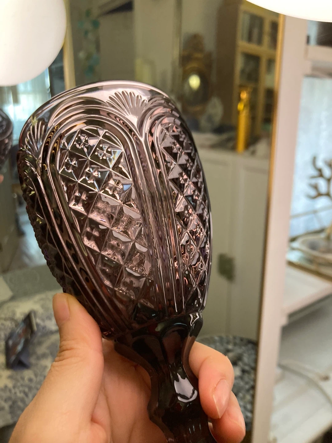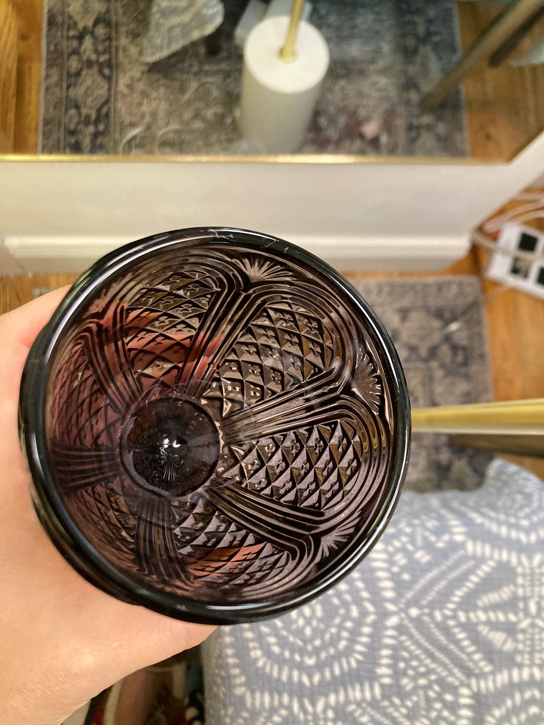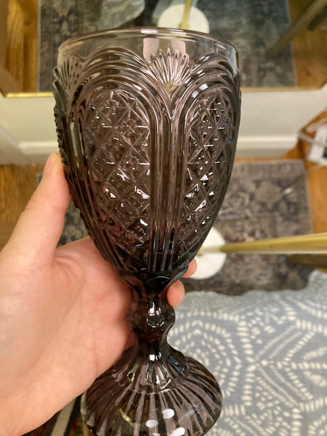 This set includes six beautiful vintage cut glass goblets. They're made of a smoky amethyst colored glass with intricate diamond and fan patterns. Dishwasher safe but hand washing recommended to preserve their delicate design.