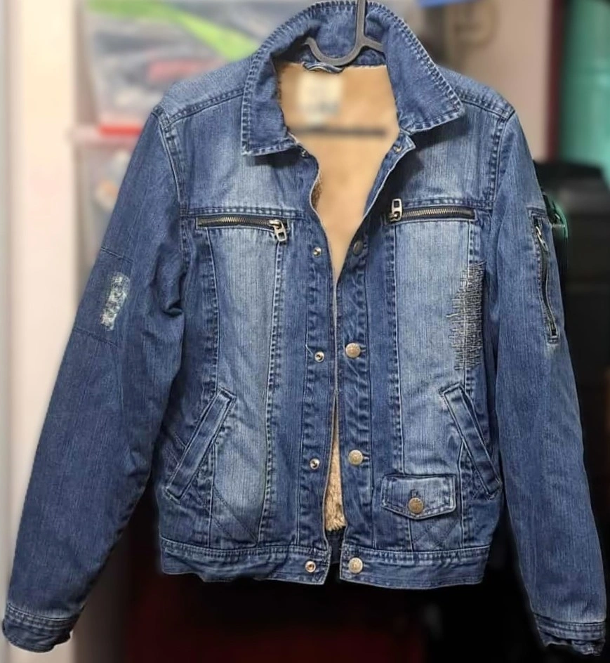 Denim Sherpa Jacket for Youth with Ripped Classic Design Distressed Sleeve. A streetwear ripped and distressed denim Sherpa jacket with vintage-inspired looks. A distressed denim jacket with a ripped design on the sleeves is a timeless staple that provides a contemporary, edgy vibe. Whether thrown over a simple tee or layered with a hoodie, this jacket is sure to make a bold statement. It is in excellent condition. For pickup and serious inquiries only.