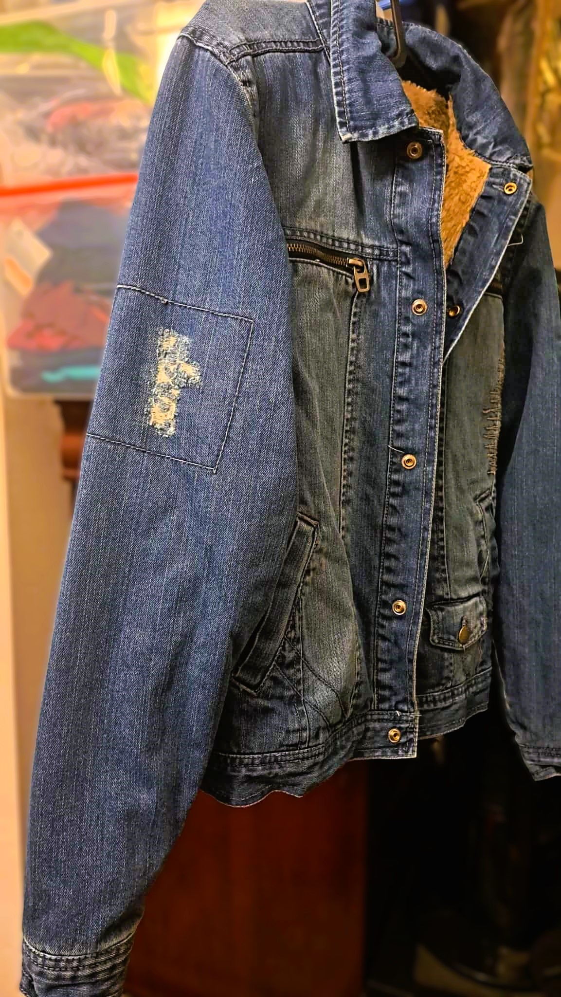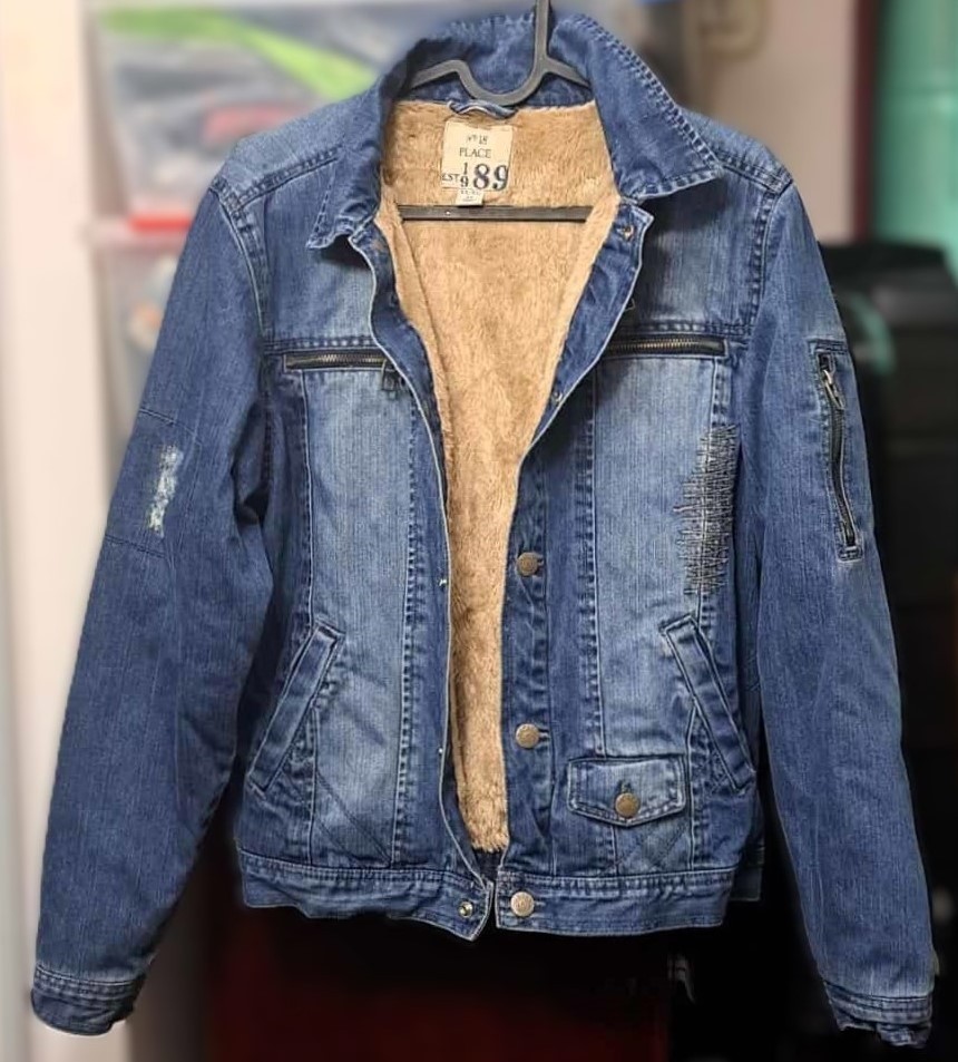 Denim Sherpa Jacket for Youth with Ripped Classic Design Distressed Sleeve. A streetwear ripped and distressed denim Sherpa jacket with vintage-inspired looks. A distressed denim jacket with a ripped design on the sleeves is a timeless staple that provides a contemporary, edgy vibe. Whether thrown over a simple tee or layered with a hoodie, this jacket is sure to make a bold statement. It is in excellent condition. For pickup and serious inquiries only.