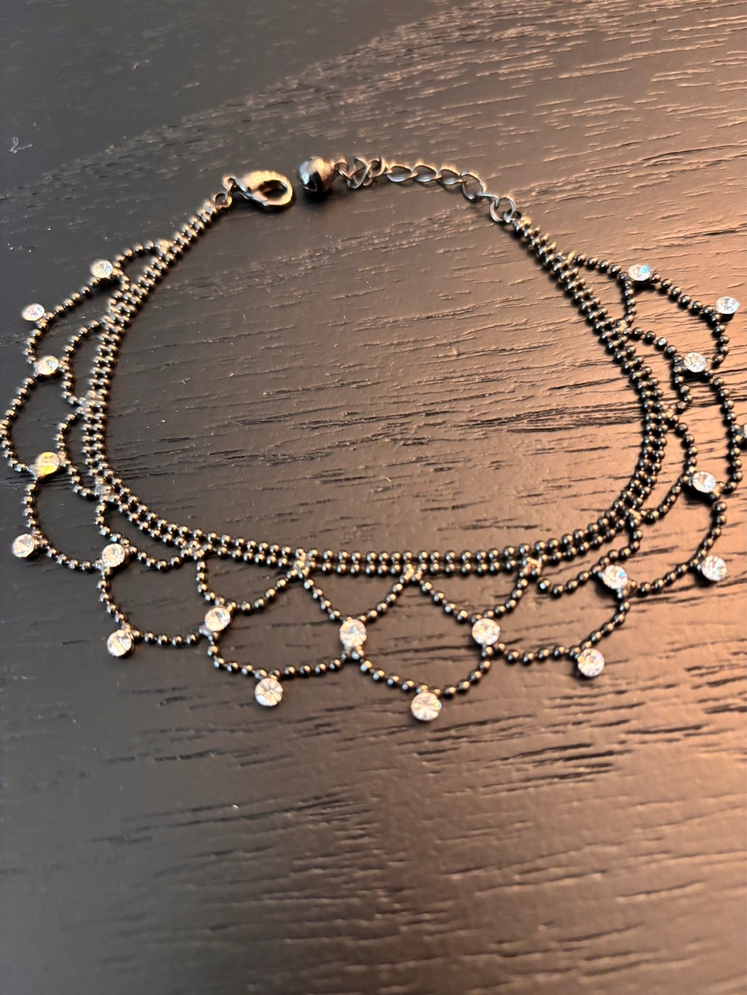 A delicate anklet featuring two strands of small black beads with dangling sections adorned with rhinestones. It has a clasp closure. Perfect for adding a touch of sparkle to an outfit!