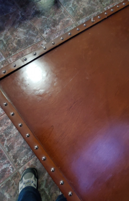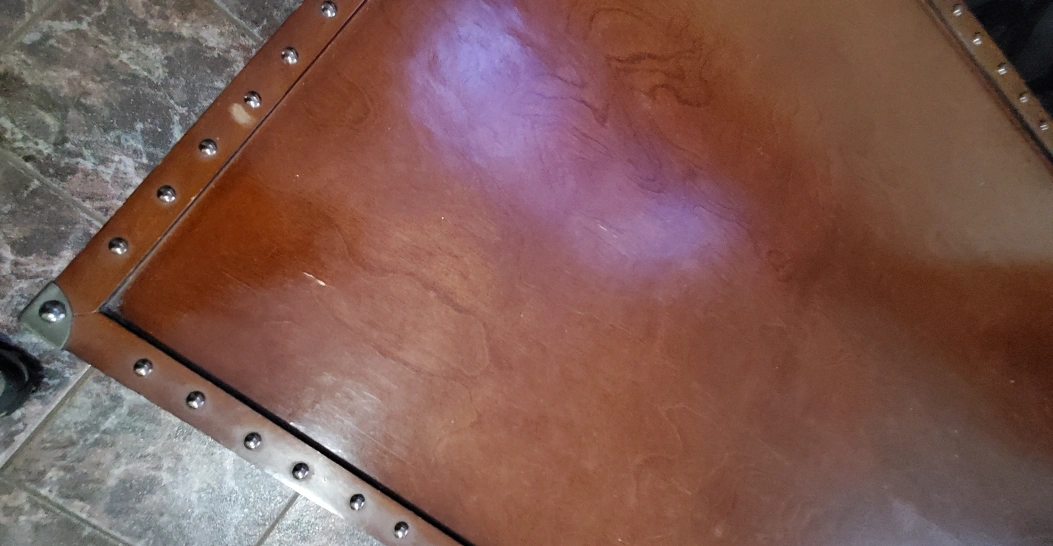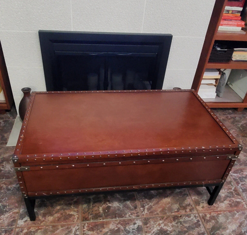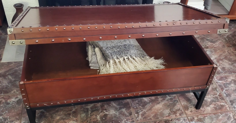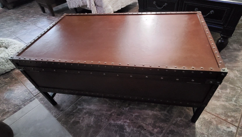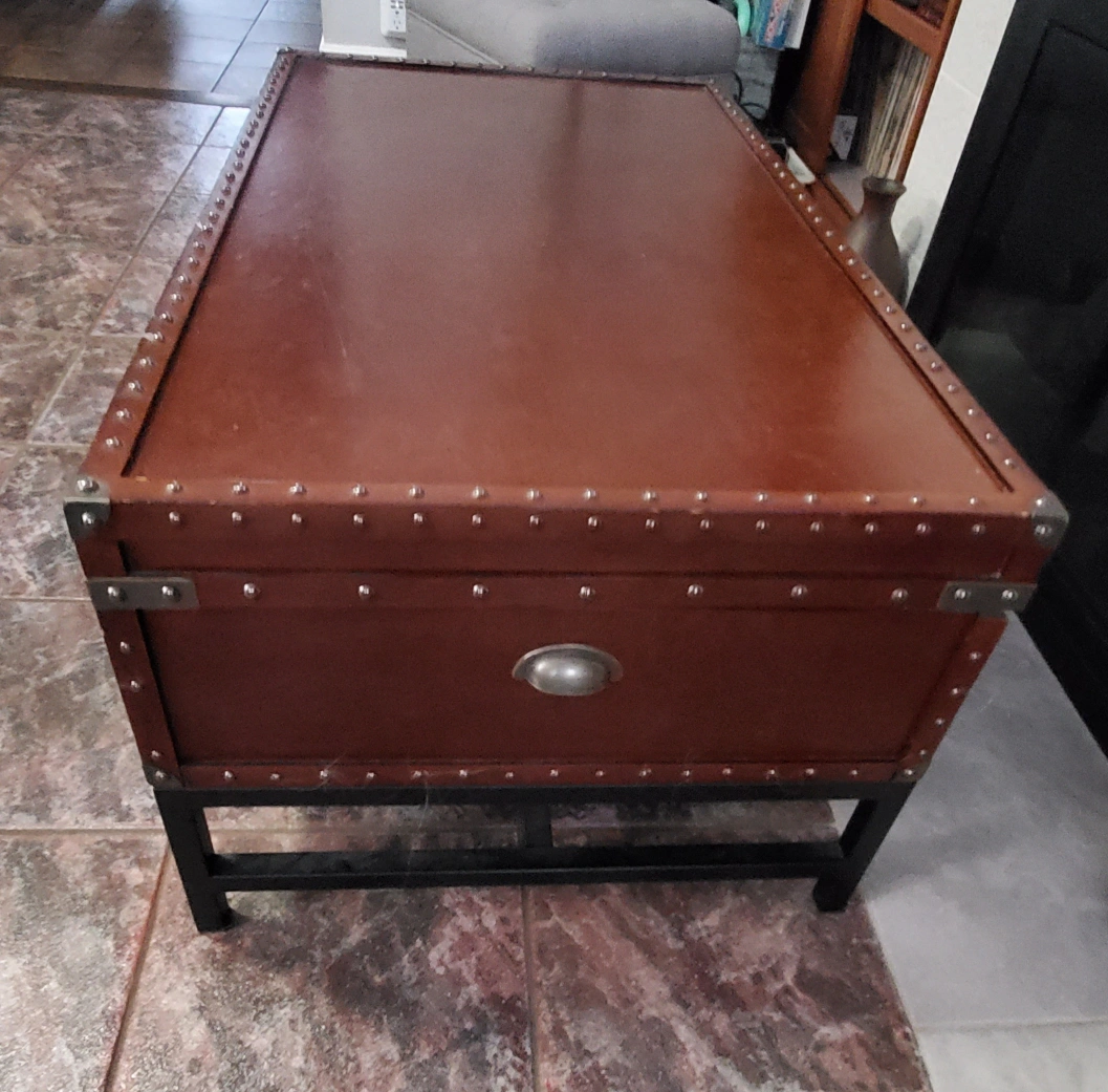 Mahogany color + black contemporary style rectangular cocktail table. Comes with a spacious hidden storage compartment