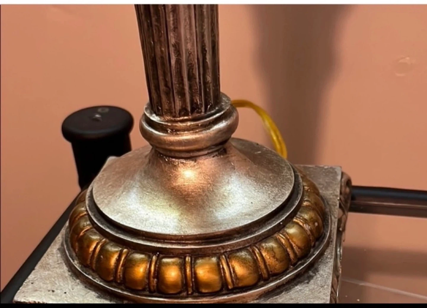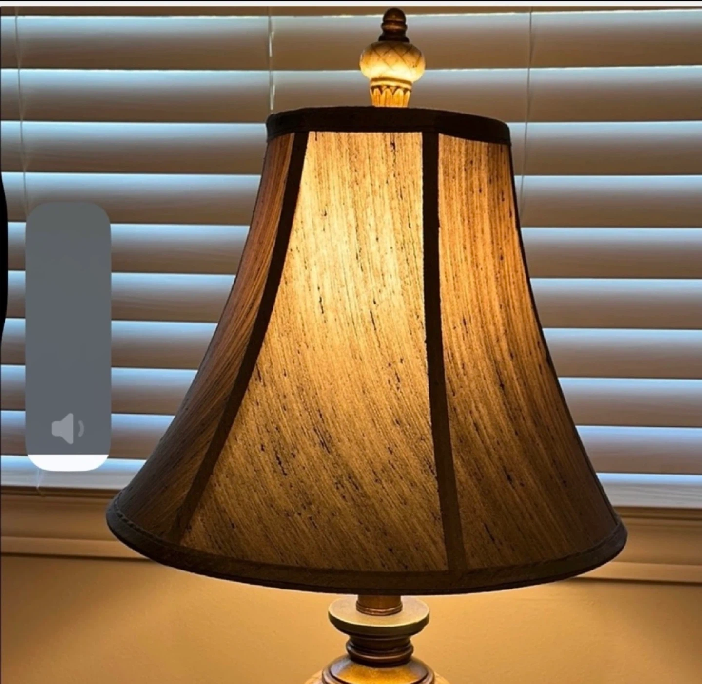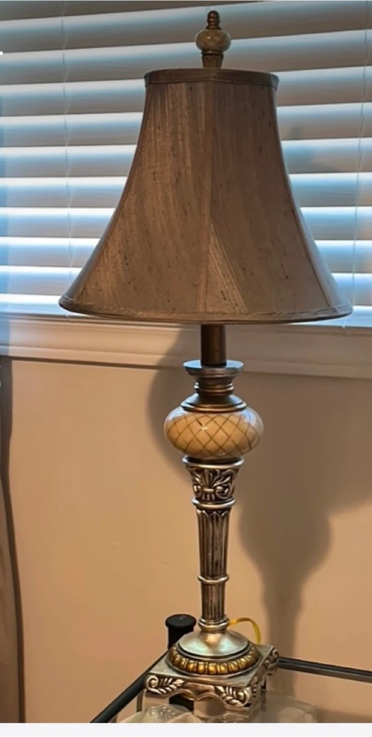 This ornate table lamp features a textured bell shade and a decorative base with carved details. It's designed to add a touch of elegance to any room. Base material appears to be metal and decorative stone.