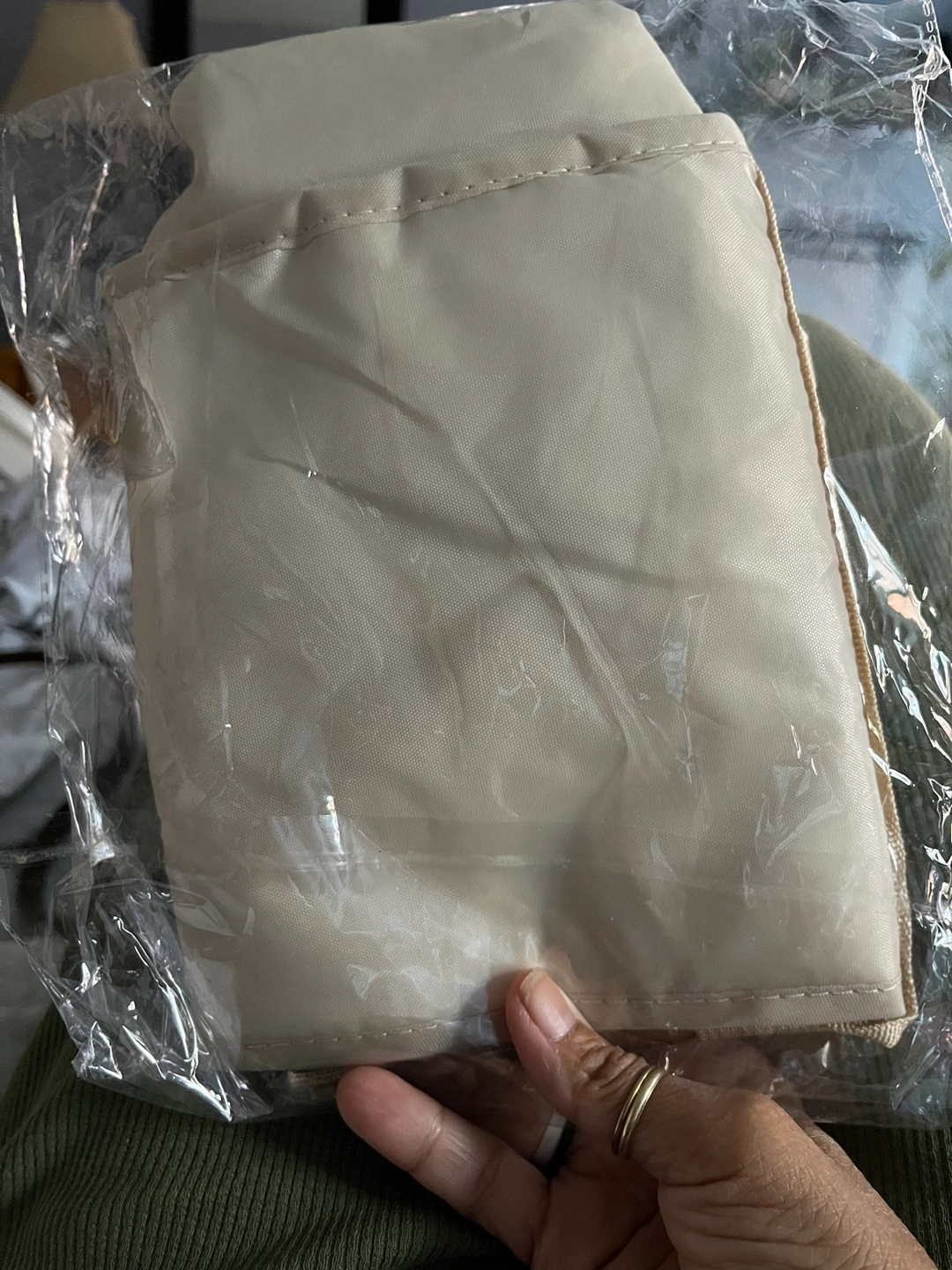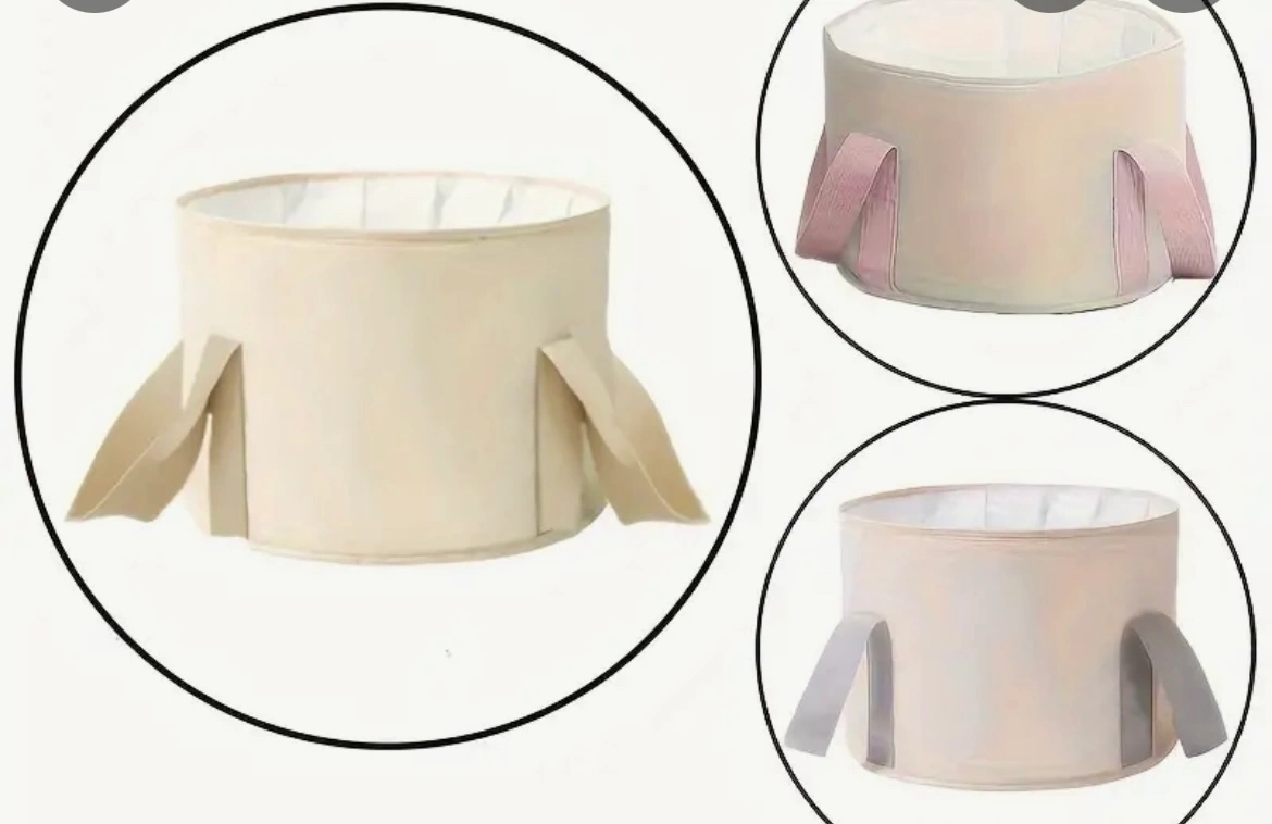 Beige foldable storage bin with handles. Perfect for organizing blankets, toys, or other items.
