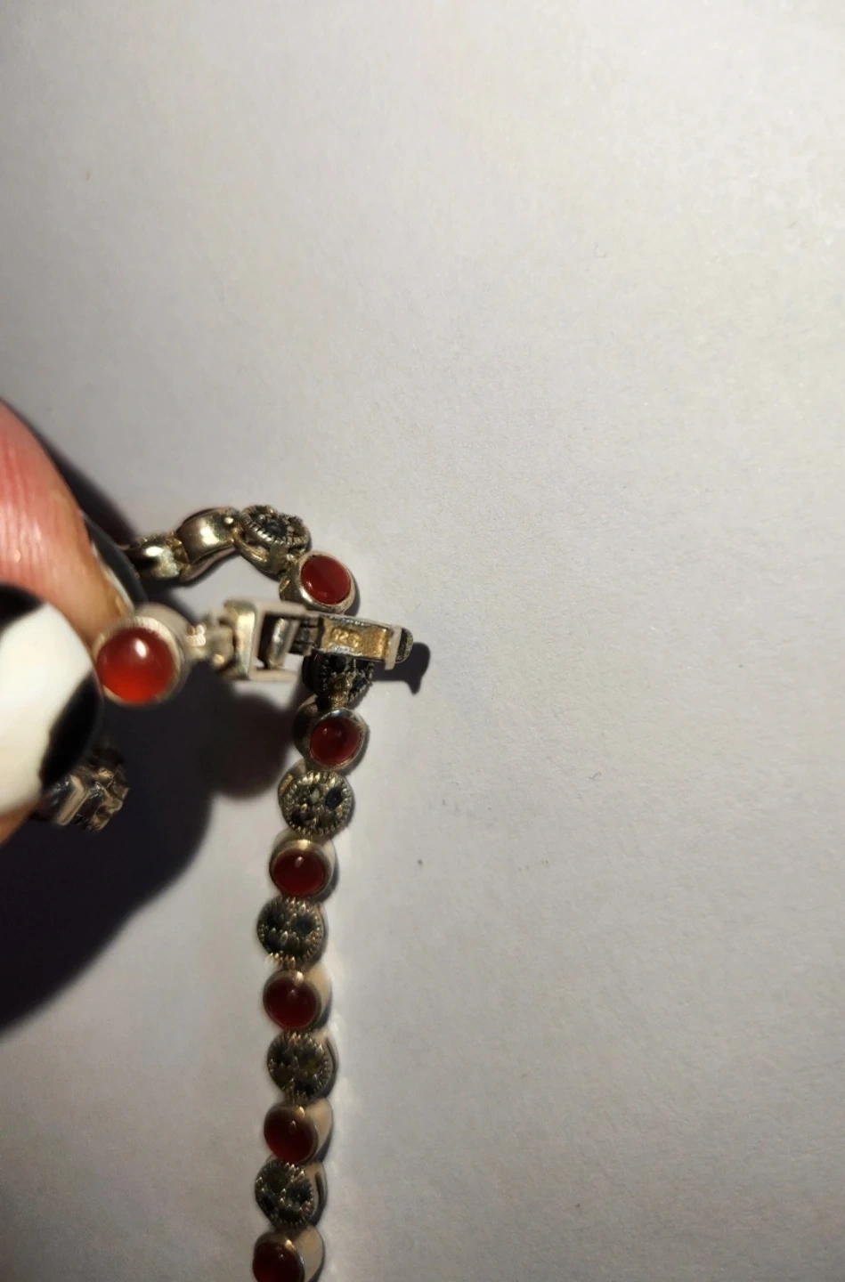 Beautiful vintage sterling silver (925) bracelet with rich red stones and sparkling marcasite accents. About 7,5 inches long with a secure clasp. Elegant, timeless piece in great condition.