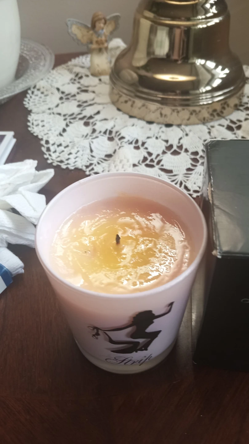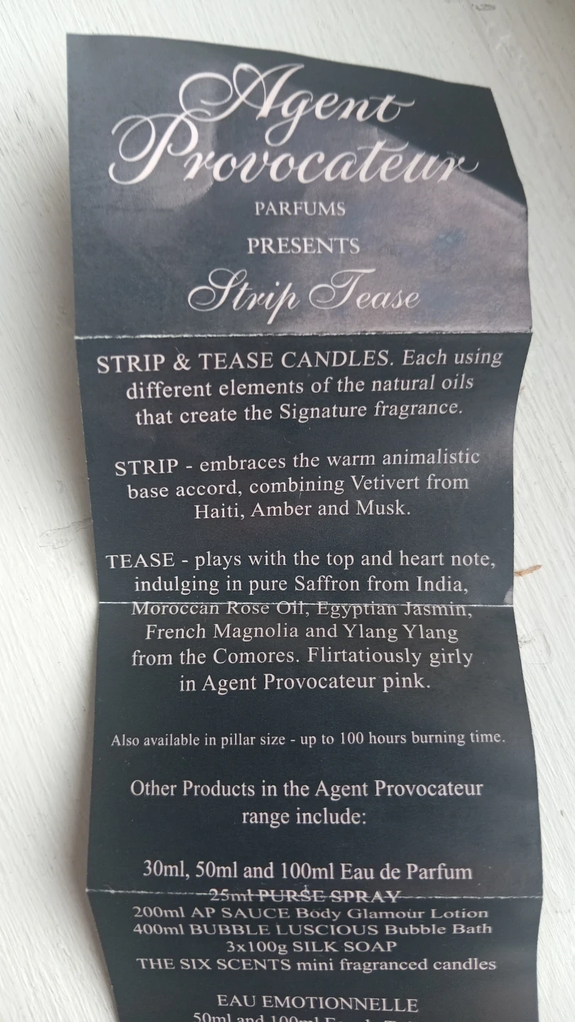 This Agent Provocateur 'Strip Tease' candle has a signature fragrance with notes of Vetivert, Haiti, Amber, Musk, Saffron, Moroccan Rose Oil, Egyptian Jasmine, French Magnolia, and Ylang Ylang. It has a burning time of up to 100 hours. The candle is housed in a pink glass with black silhouette detailing.