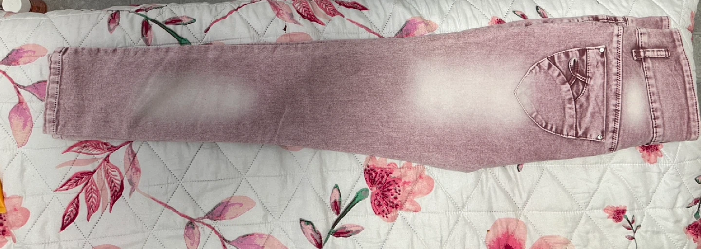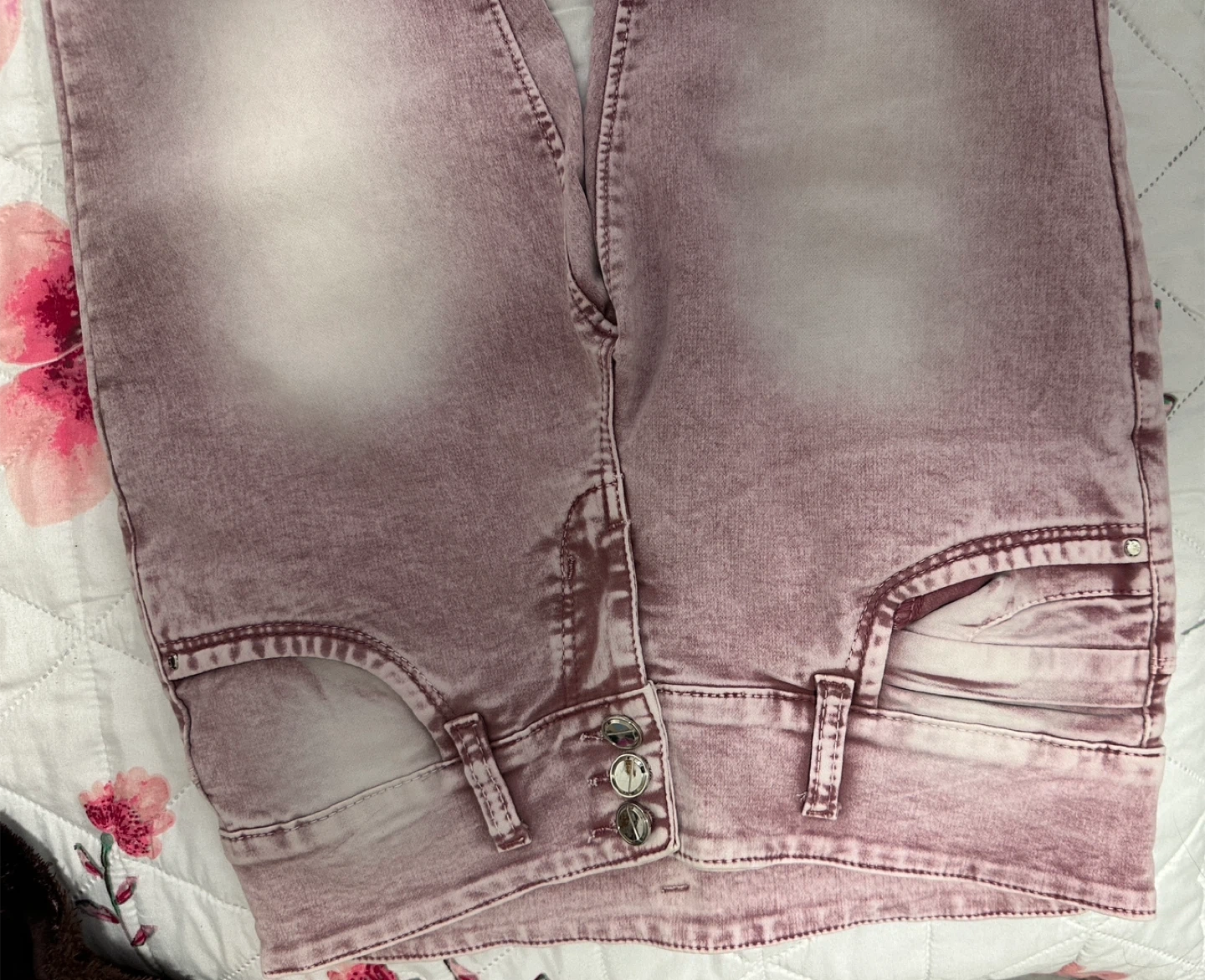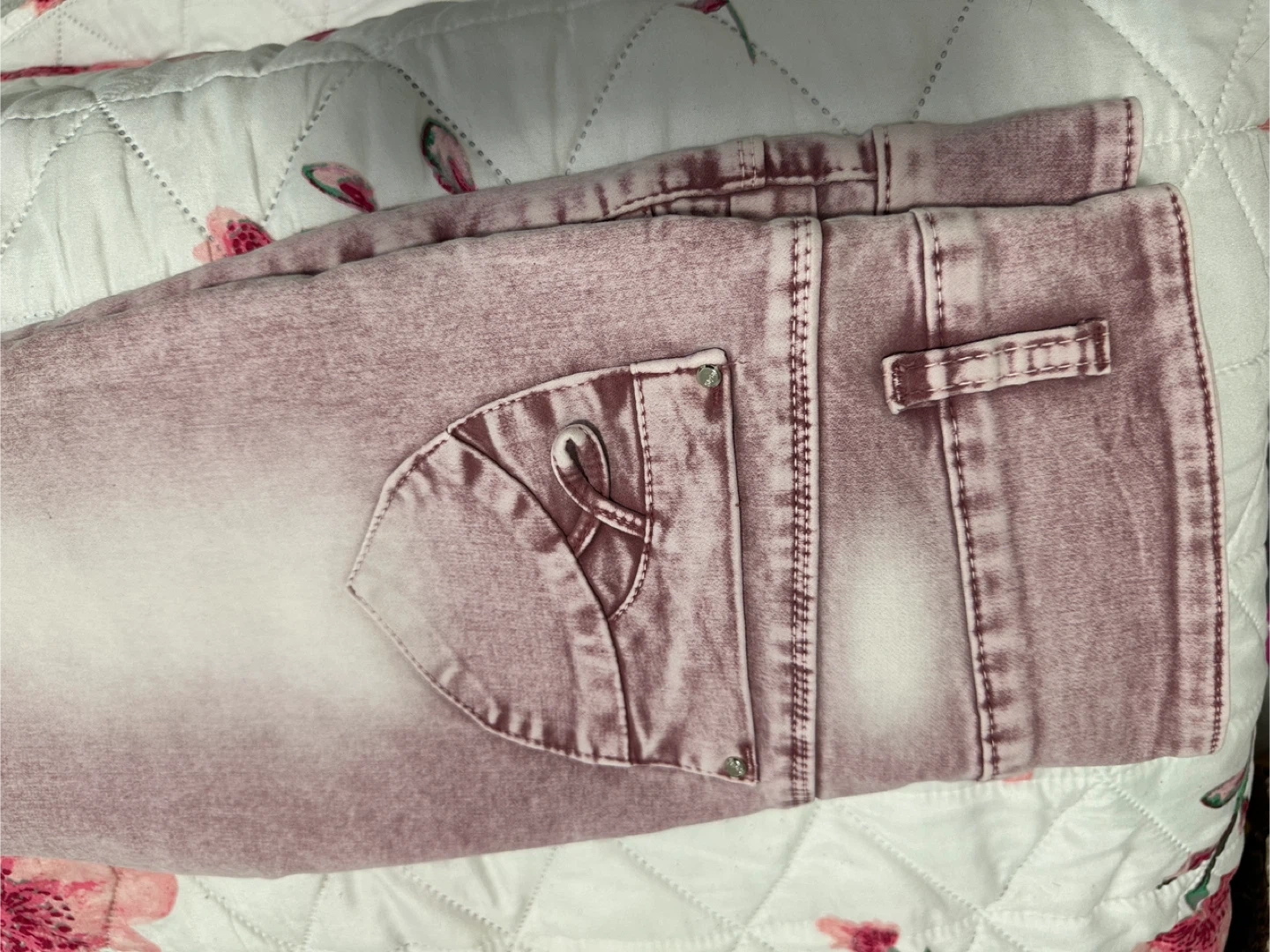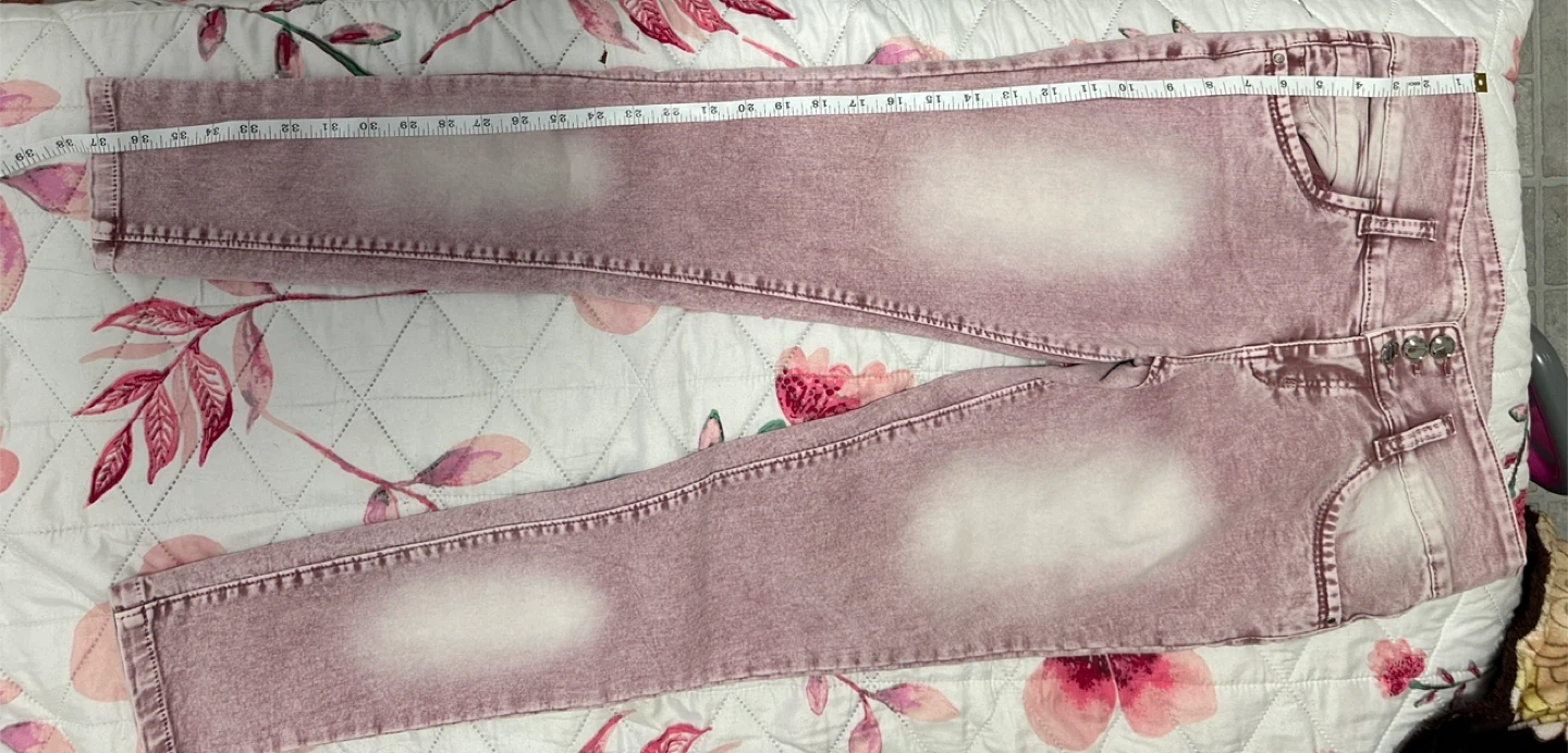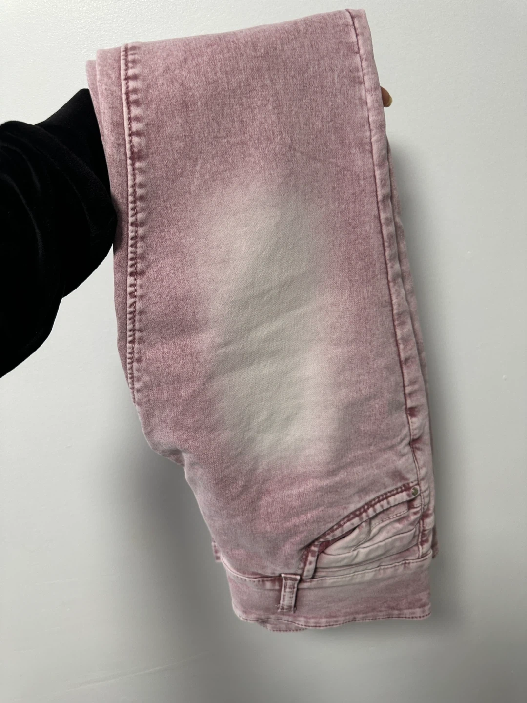 For sale are pink acid wash jeans with a distinctive faded appearance. The jeans have a button fly closure and a waist measurement of approximately 28 inches. They are comfortable to wear. The price is open to negotiation.