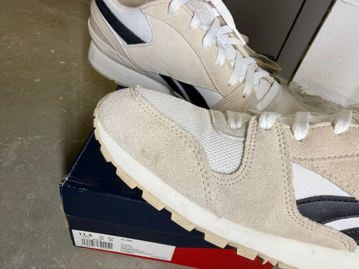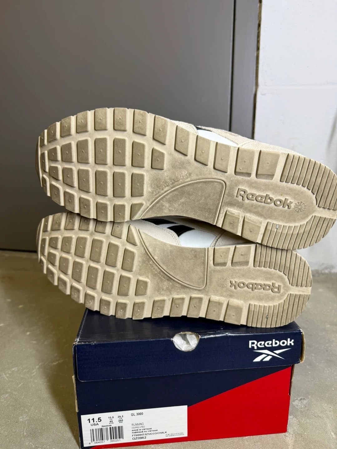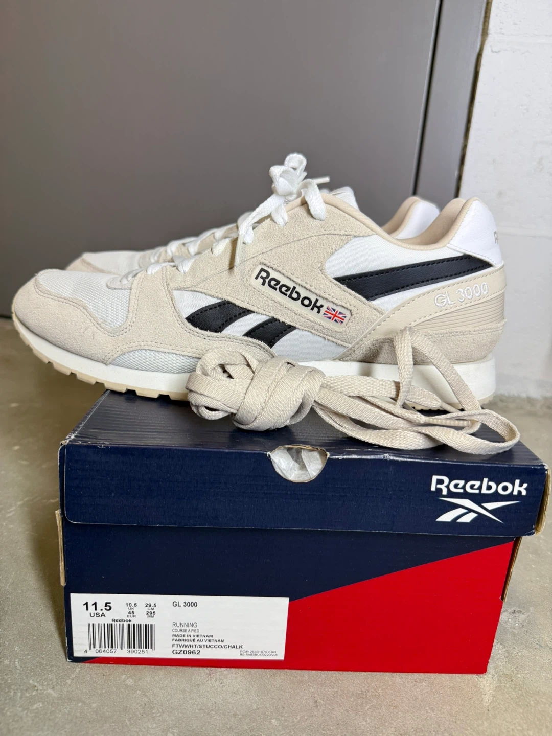 These Reebok GL 3000 sneakers come in a classic beige and white colourway. They feature a combination of suede and mesh uppers. Includes the original box. Size is 11.5 US men's.